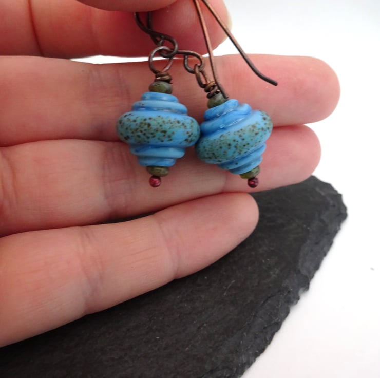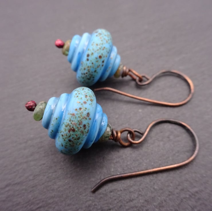 A pair of earrings made with handmade copper ear wires and handmade lampwork glass beads.