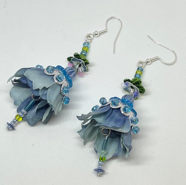 Dangle earrings inspired by beautiful Bluebells and made from up-cycled faux flowers and pre-loved beads.