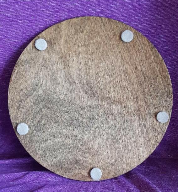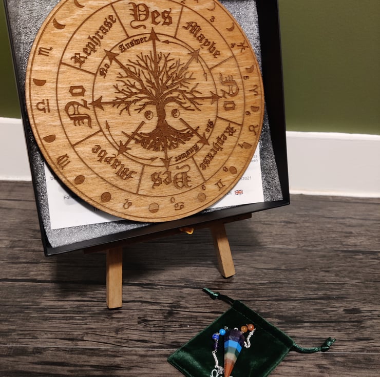I’ve designed this exquisite pendulum board which has the tree of life centre yes, no, rephrase, maybe and no answer, moon phases and the horoscope alchemy signs surrounding the board along with illustrations design by myself all which has been etched into the responsibly source plywood from the UK which is 5mm thick and 225mm in diameter it has been oiled and sealed with wax to bring the grain out, comes in an sturdy presentation box and a chakra themed dowsing crystal.