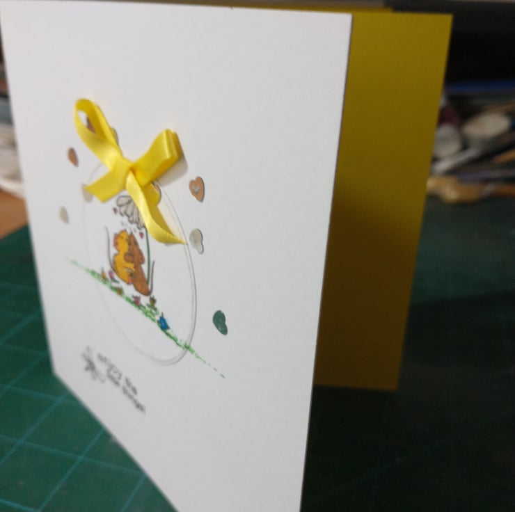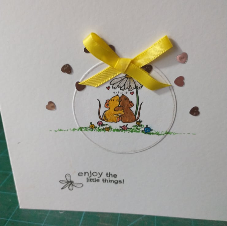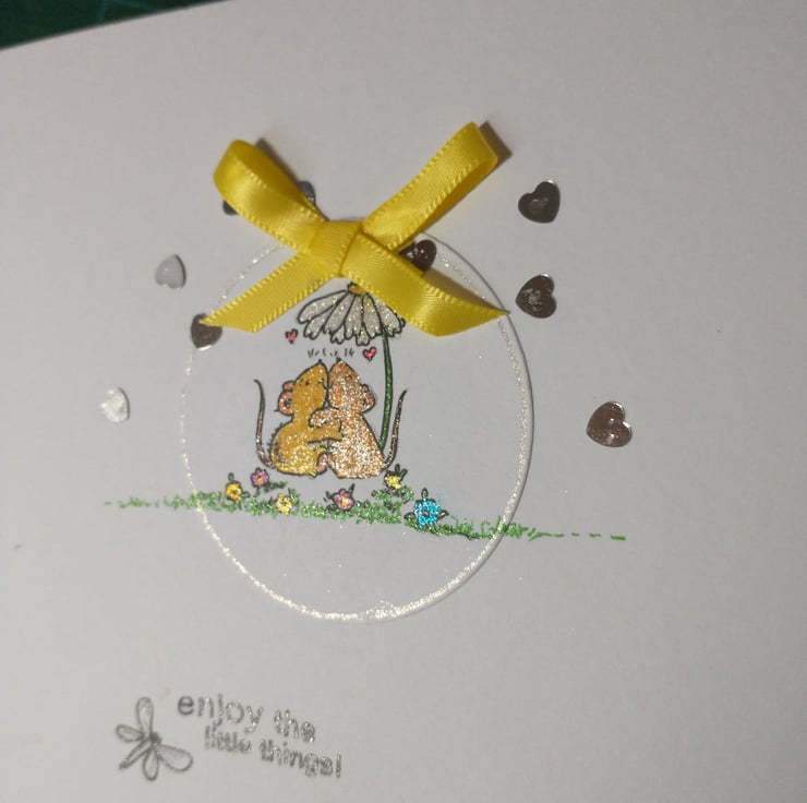 A completely handmade and uniquely designed card. Consisting of a cute image of two mice hugging hand stamped and hand coloured onto a circle of white card. Mounted onto quality white card. Enjoy the little things in black. Silver heart embellished and finished off with a yellow ribbon bow