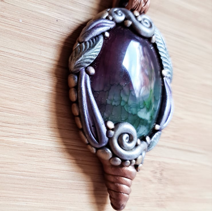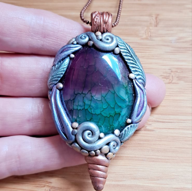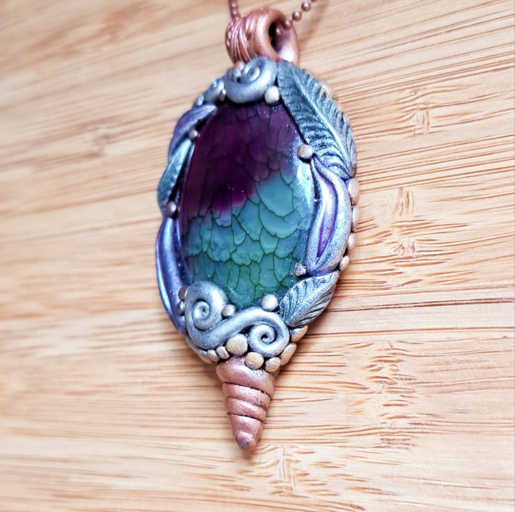 A lovely vibrant amulet handcrafted from beautiful dragon vein's agate crystal and polymer clay. Have added some metallic paint to the clay to enhance the colour. It is finished with a coppertone fine ball chain.