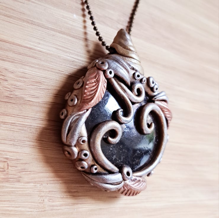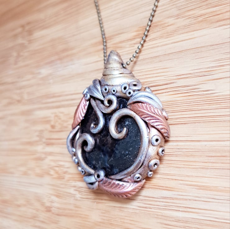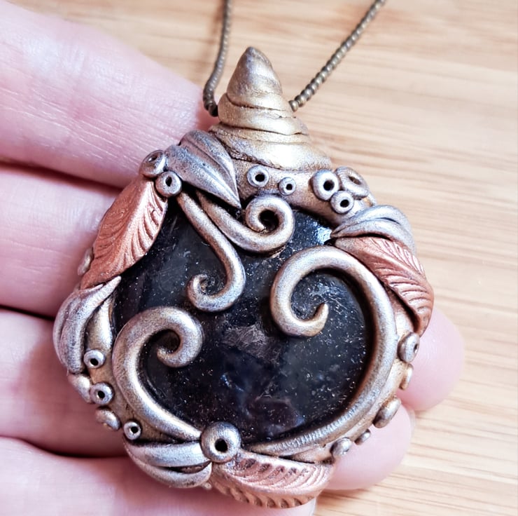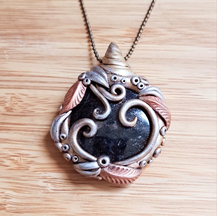 A gorgeous amulet handcrafted from flashy coppernite crystal and polymer clay. Have added some metallic paint to the clay to enhance the colour.