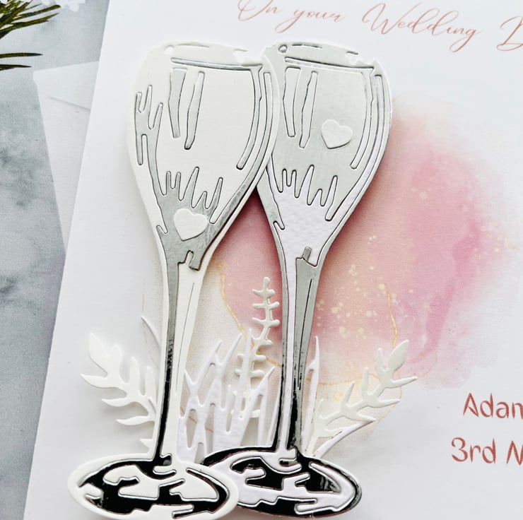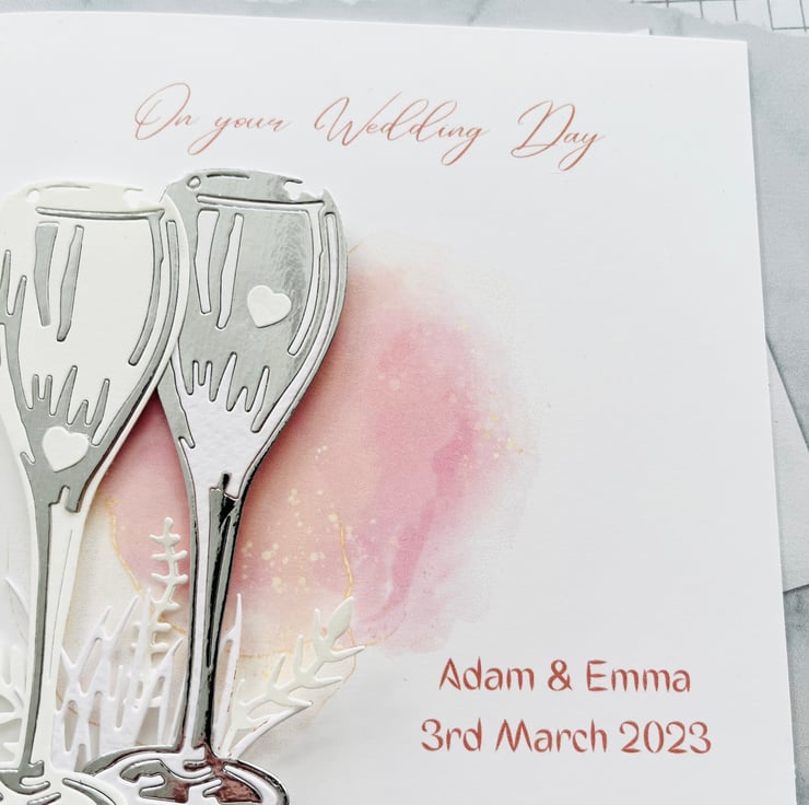 The card features: Congratulations on your wedding day with 2 elegant Champagne glasses on a beach theme background