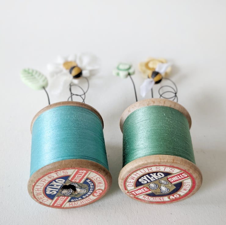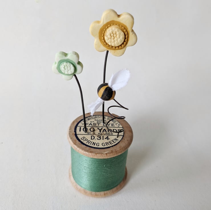 I love finding old bobbins on rummaging trips! The tiny bee bounces on top.