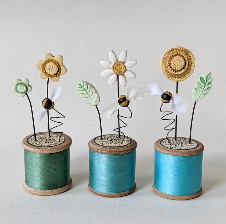 The flowers are made from polymer clay, fired and painted to finish. The bee is made from painted wood and fabric.