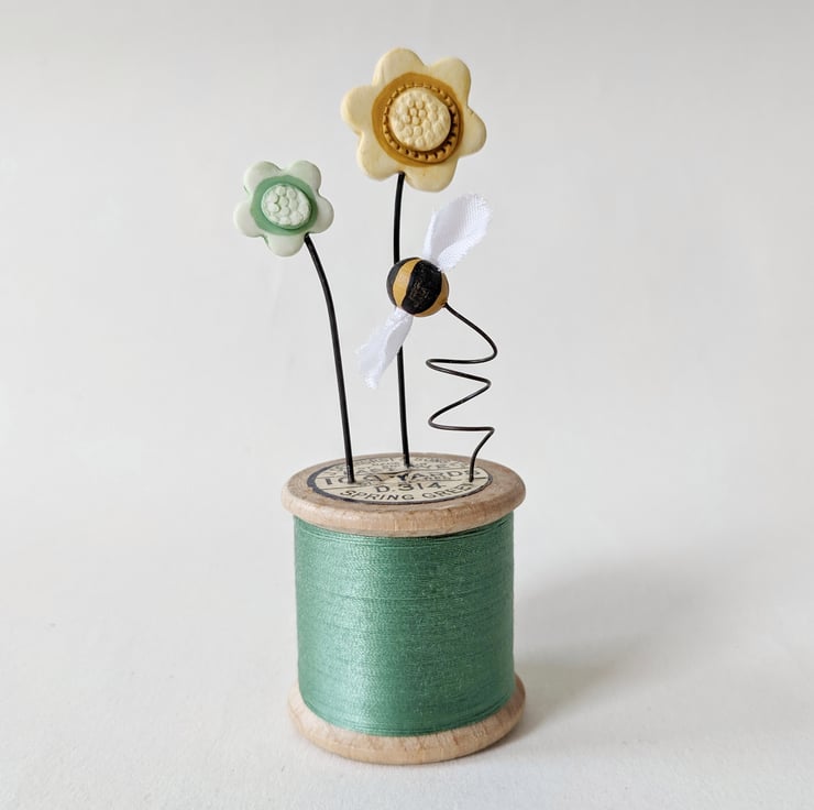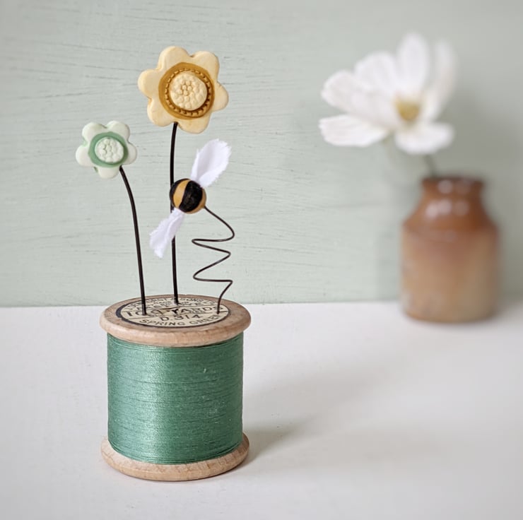 A handmade little bee buzzes by flowers in a vintage wooden bobbin.
