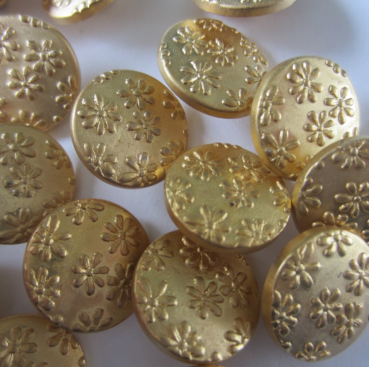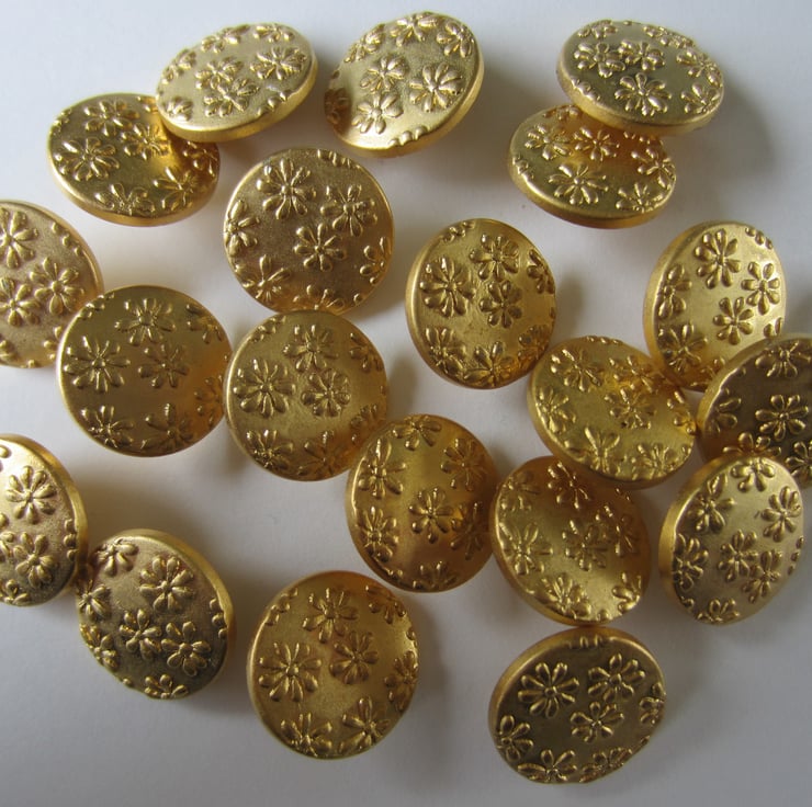 20 gold tone metal buttons with flower pattern. They are a brighter gold colour than shows in pictures.