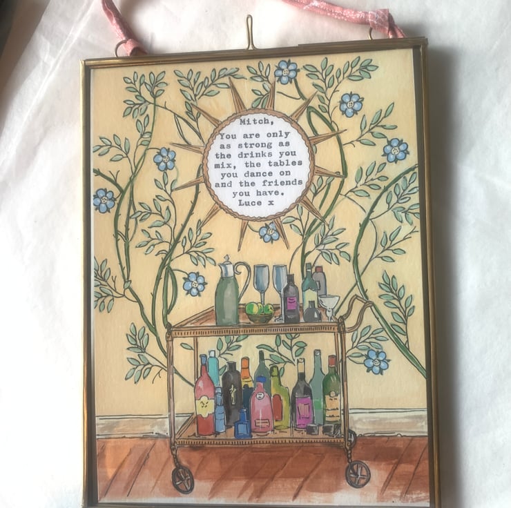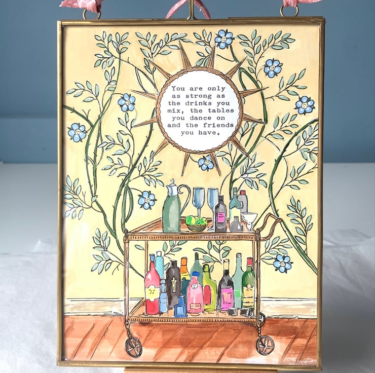 This is a giclee print of my drinks trolley artwork. The quote is vintage typed "You are only as strong as the drinks you mix, the tables you dance on and the friends you have." or chose your own wording, can be personalised. Artwork is approx 15cmx20cm and comes in a brass and glass hanging frame. Frame approx 15cmx20cm