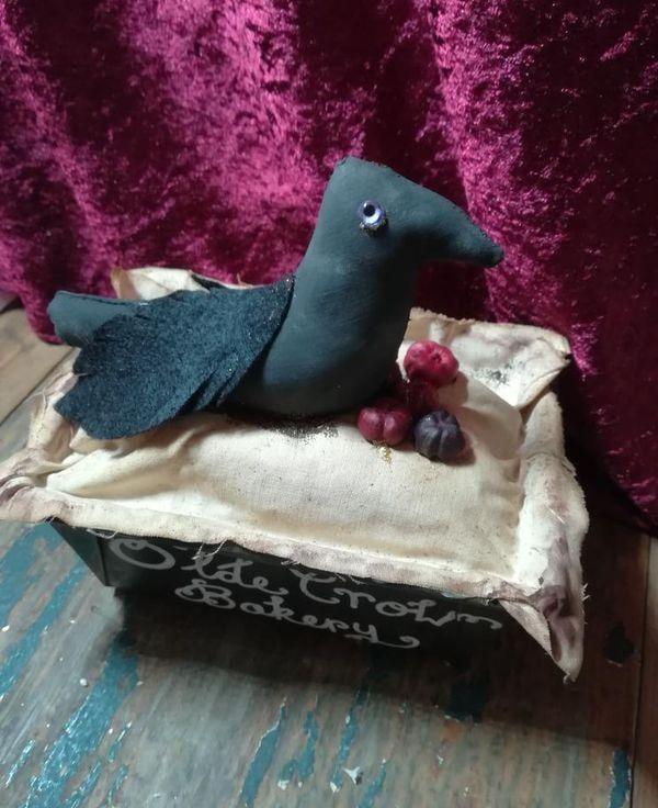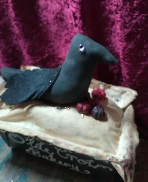 I made a fabric crow which is hand painted and stained with small glass eyes and glittering details