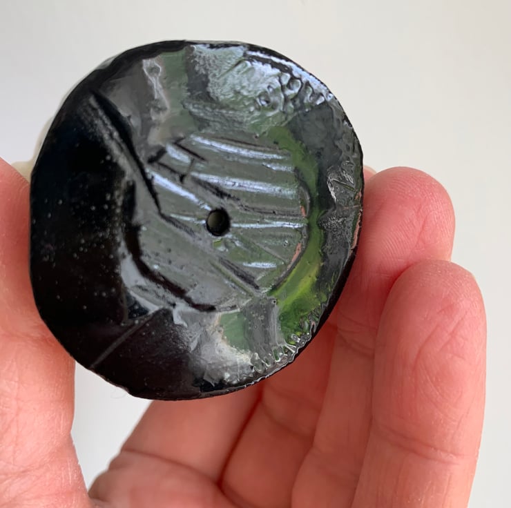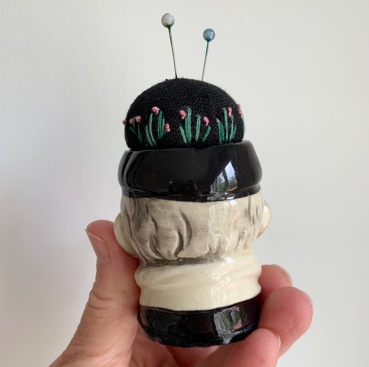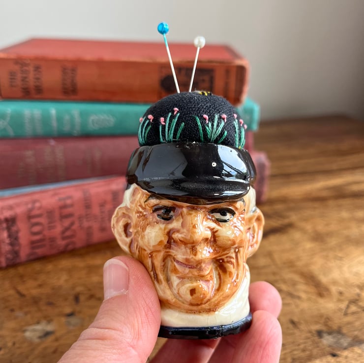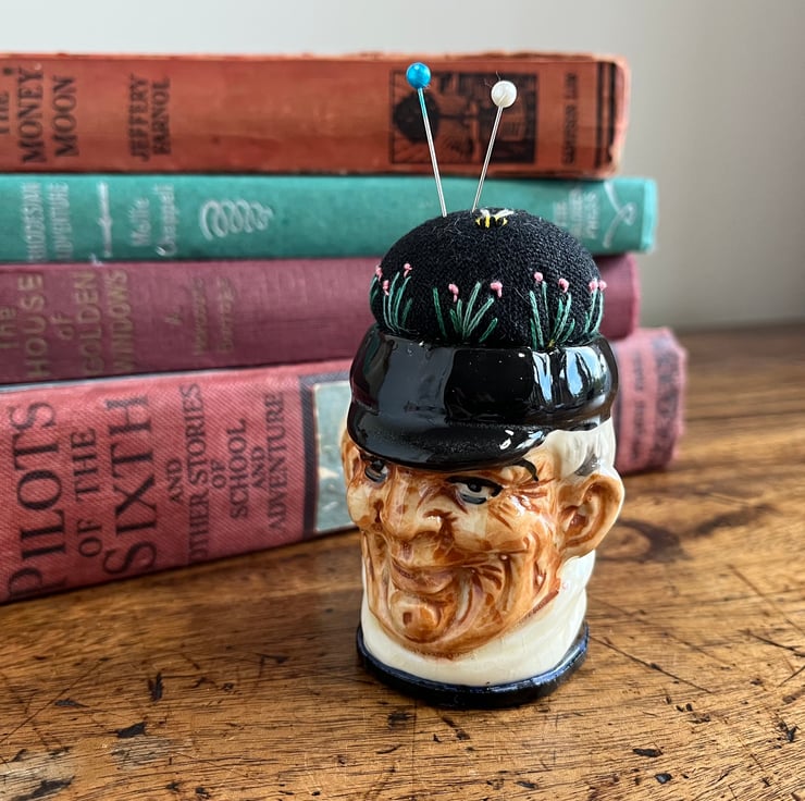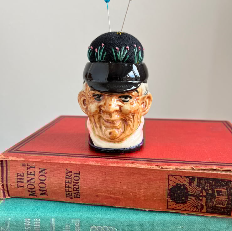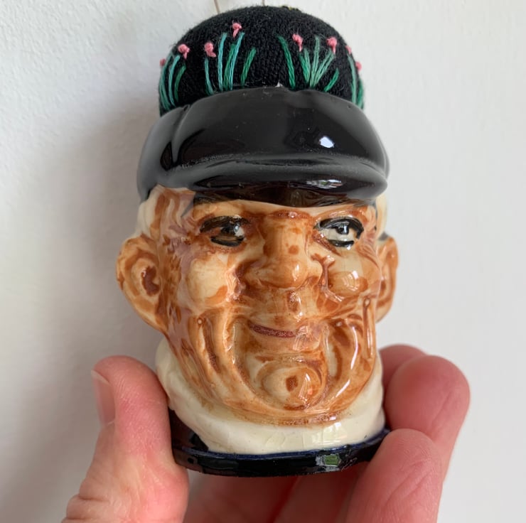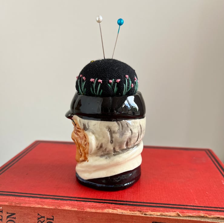 Pincushion in a vintage fisherman’s face pot in a toby jug style. The black linen cushion has been embroidered with tiny flowers and a bee.