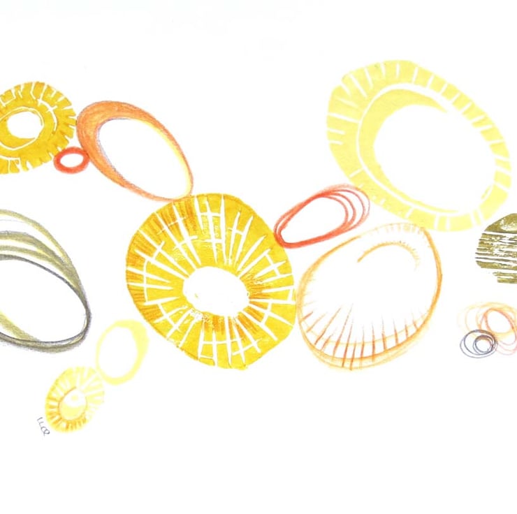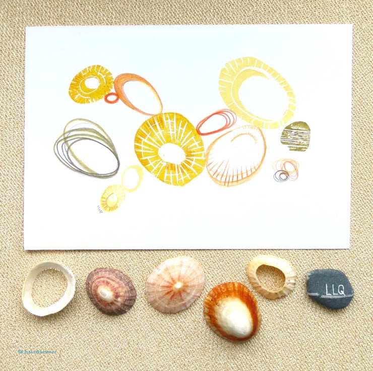 This picture is from a bright and varied edition of monoprints with added drawing of limpet shells and pebbles washed up by the tide and is part of an ongoing series.