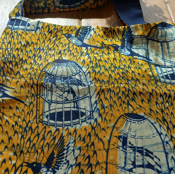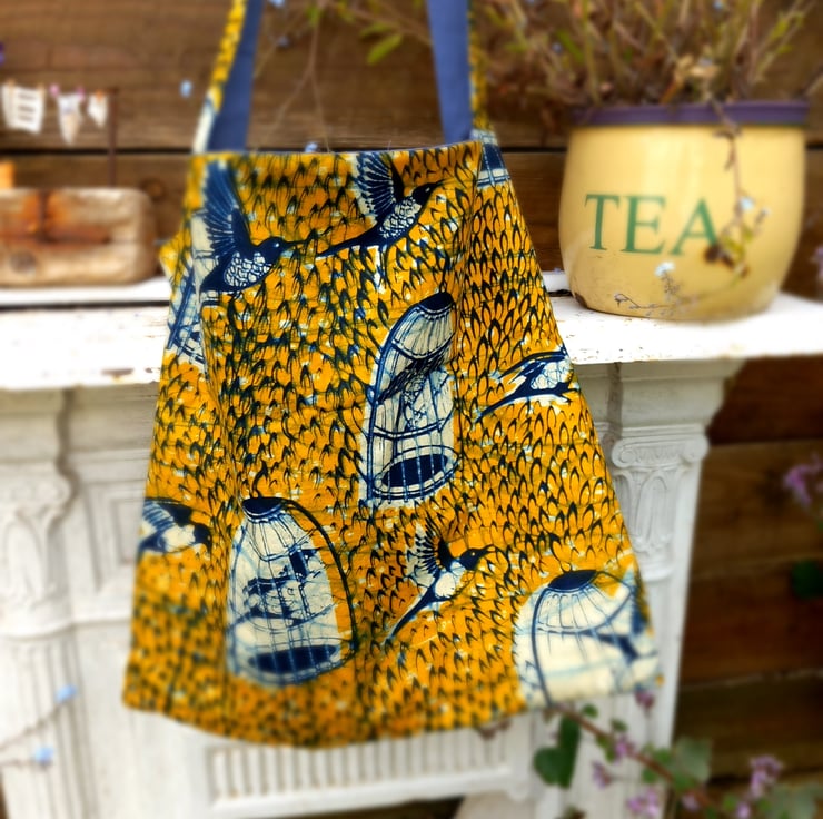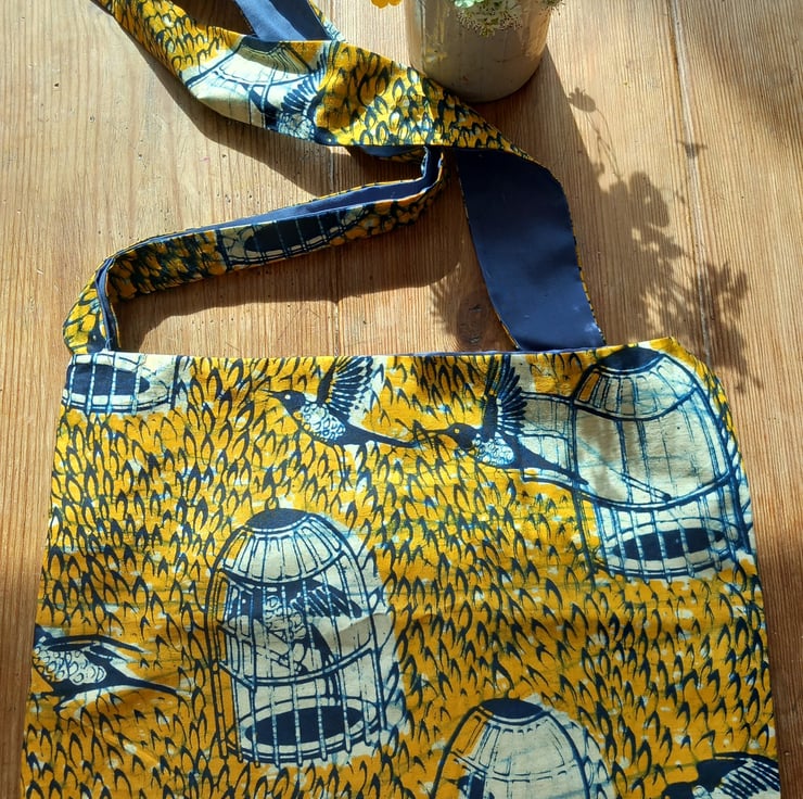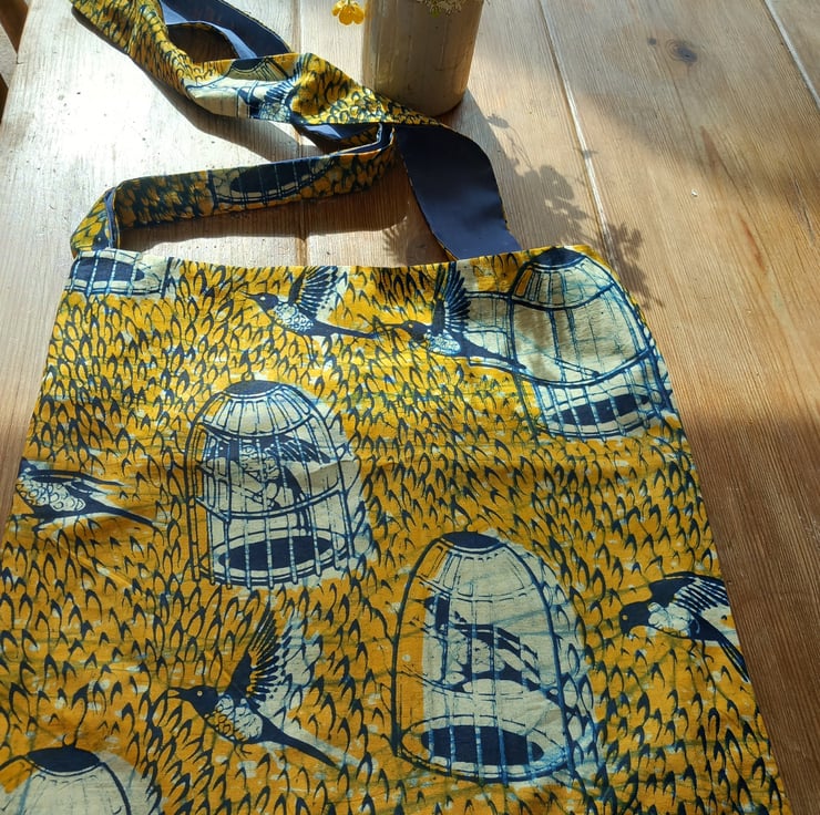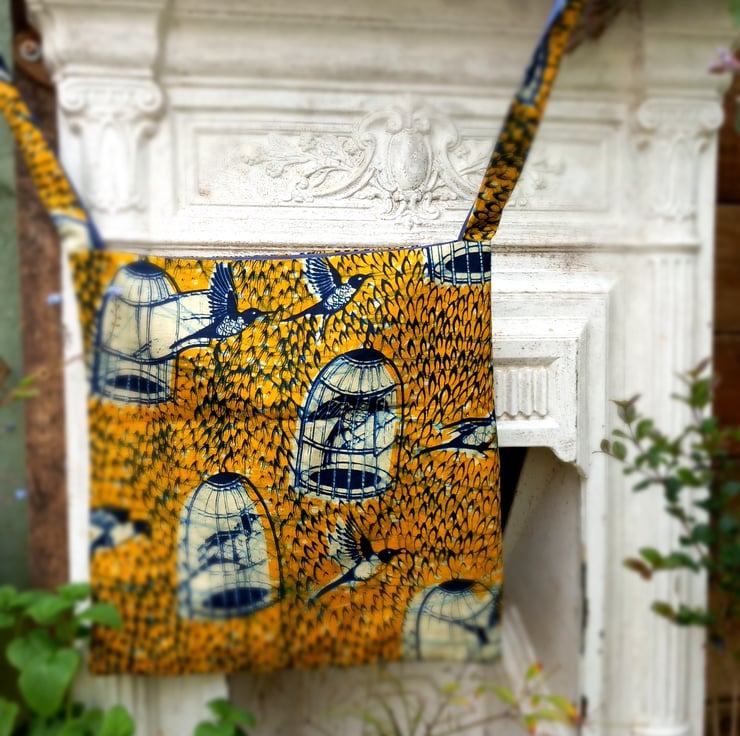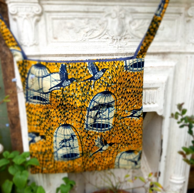 Beautiful fabric, long strap on the bag to go across the body. Just one made in this fabric. Filled lined and seams overlocked inside. One off handmade bag x spox 35 cm square