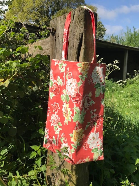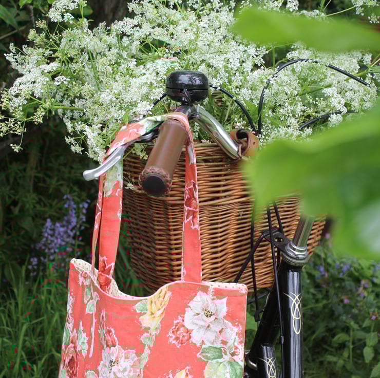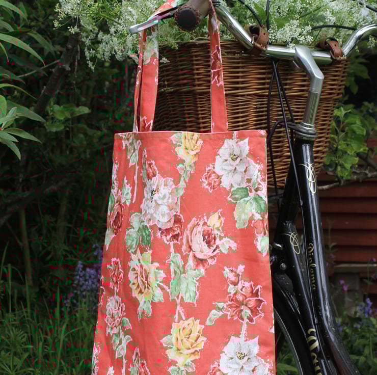 Perfect for Summer, this gorgeous floral shopping bag is made from a remnant of vintage Sanderson 'Grace' fabric featuring rose stems on a brick red background. The fabric is new from an unused remnant of curtain fabric dating back to 1997. I have lined it with a co-ordinating cream and sage green polka dot cotton fabric