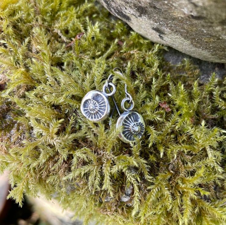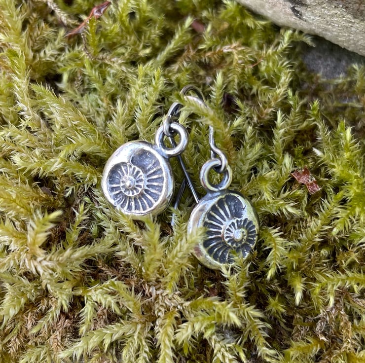 These earrings are made using a real ammonite fossil as the master. I have oxidised the silver dark in the recesses to highlight the pattern.