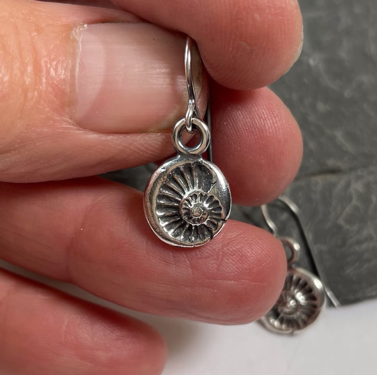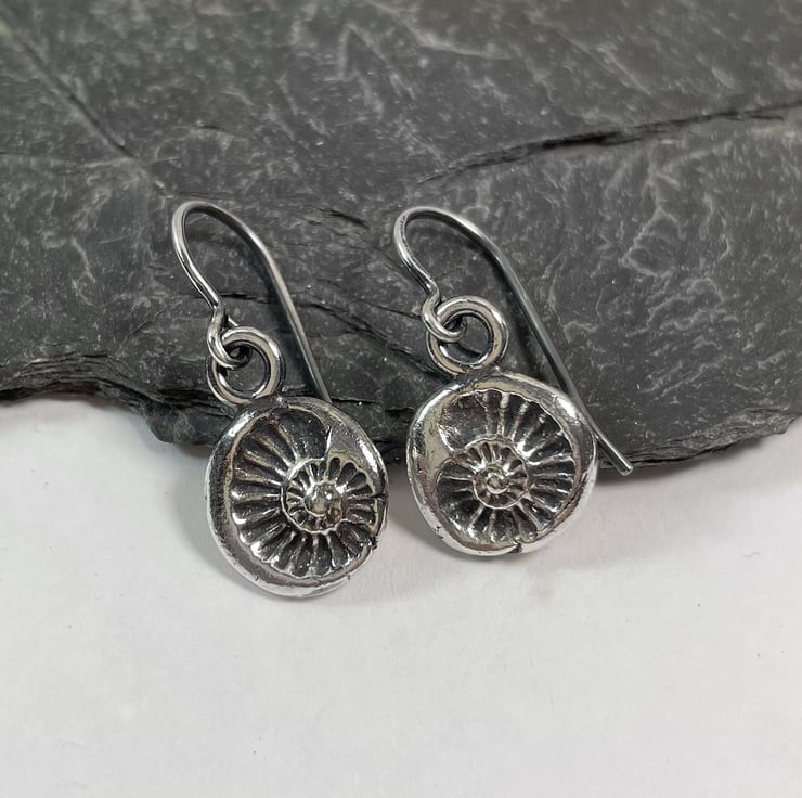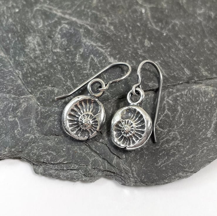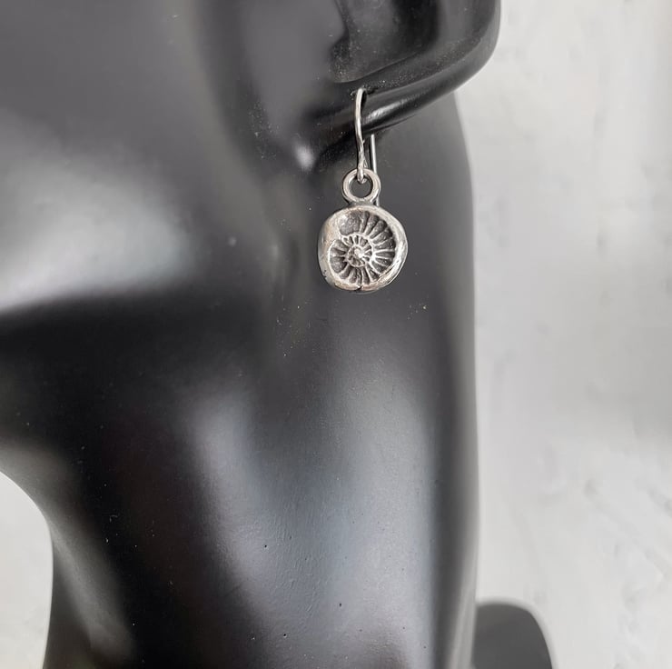 Fine silver ammonite impression earrings on sterling silver hooks.