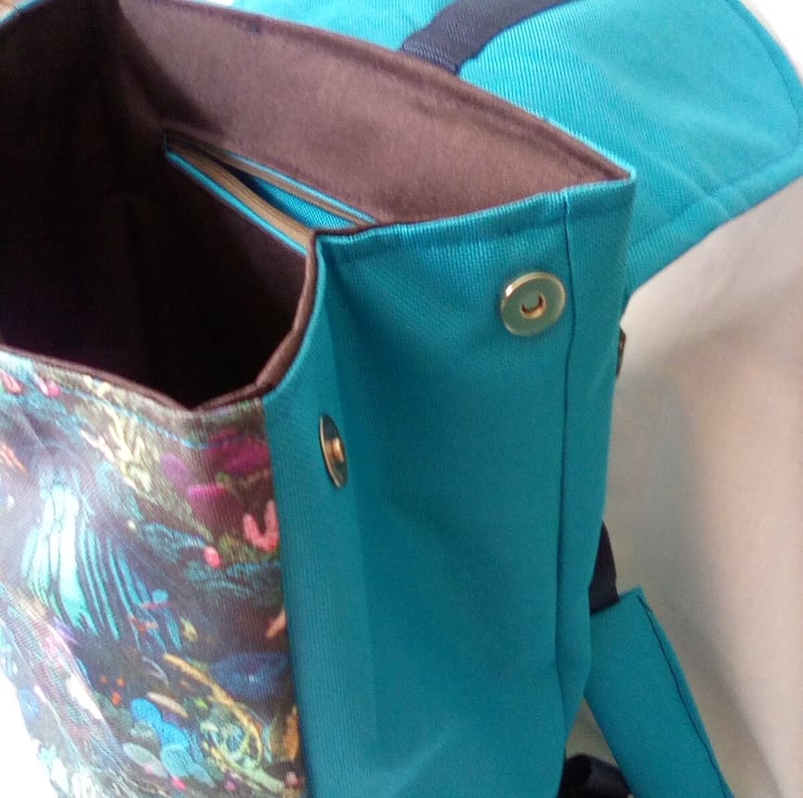 The outer fabric is new shower proof polyester fabric in an enchanted forest design , and has a waterproof canvas on the reverse, The lining fabric is waterproof canvas very hard wearing and will keep your items dry. It also has a hidden zip pocket also in waterproof canvas.