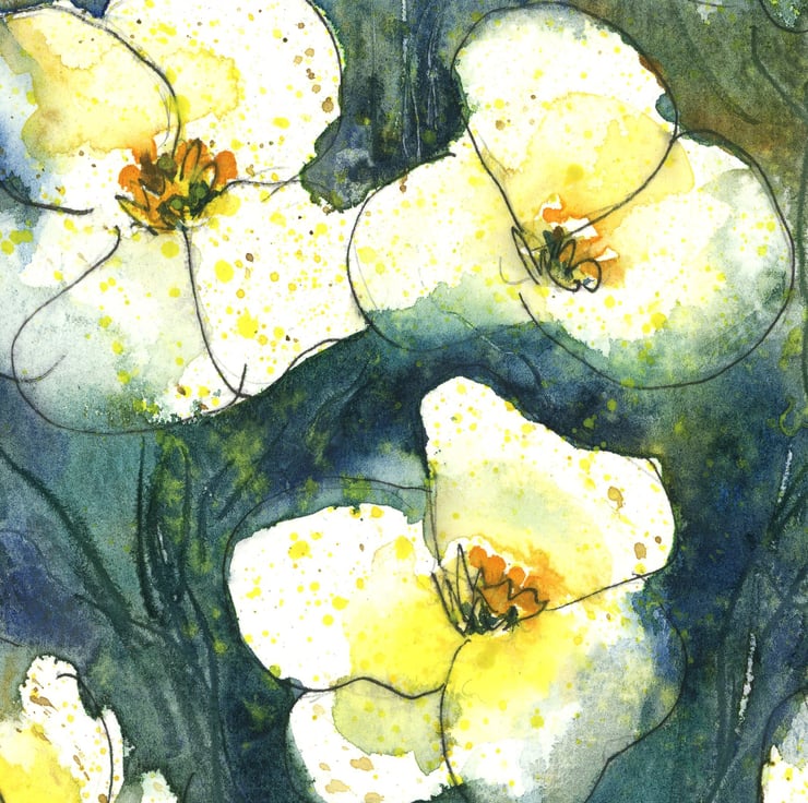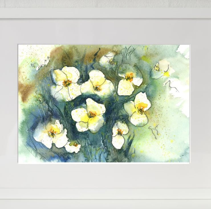 In this original piece of art, I've tried to captured the subtle light of a cool, spring woodland floor. THe pale and delicate daisies canvey a delicacy against the background of greens, cool bluey greys and browns, indicating the surrounding foliage of the woodland floor.