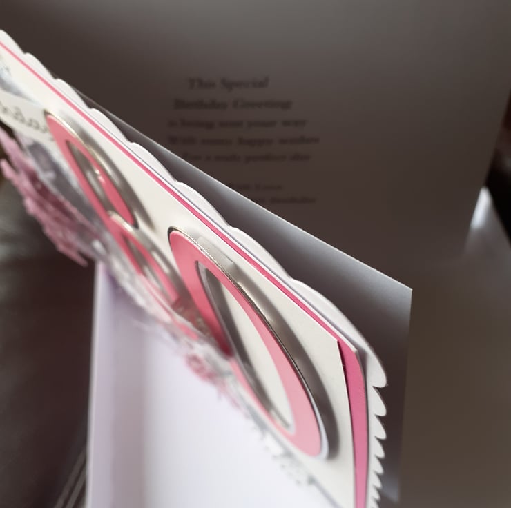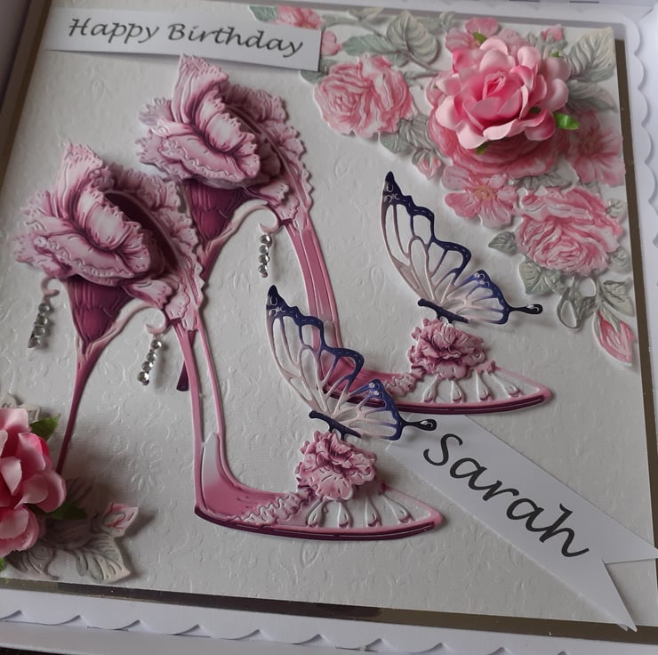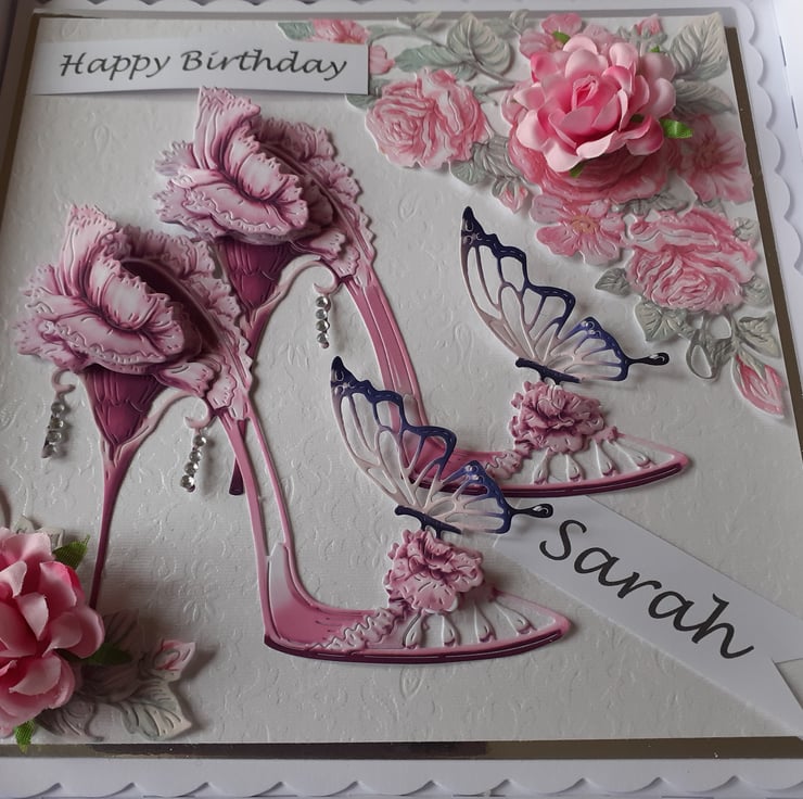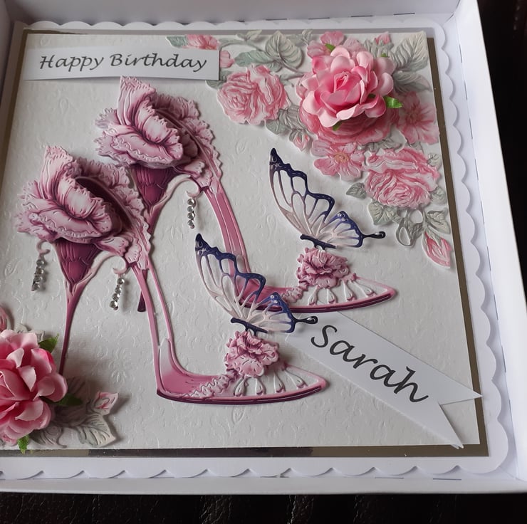 This is a new Handmade Shoes and Flowers Birthday Card. Size 8ins x 8ins. Inside verse included. Any name or occasion can be added to front of card. Supplied in a box with see through lid.
