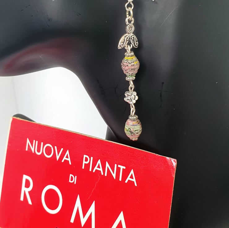 Long, thin and light dangling paper beaded earrings made with a 1967 old map of Rome.