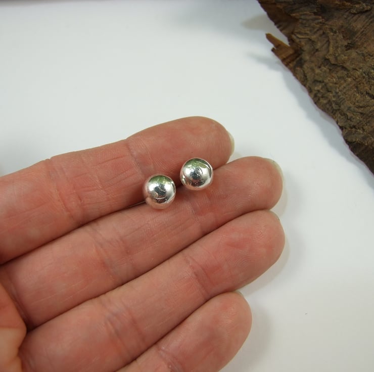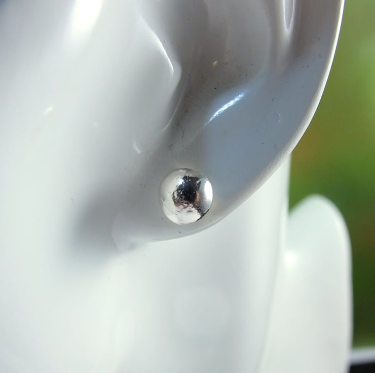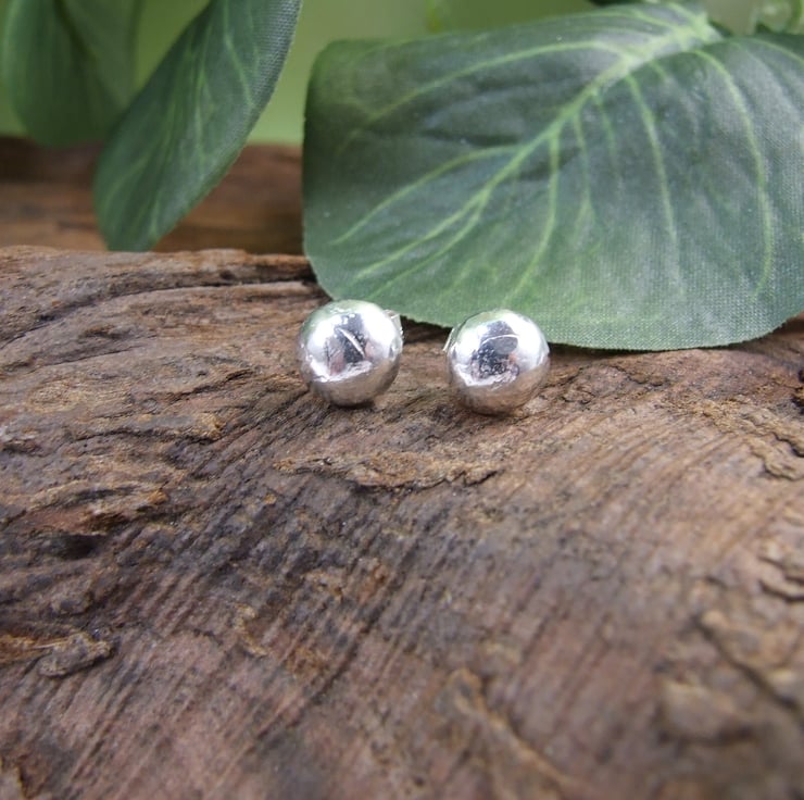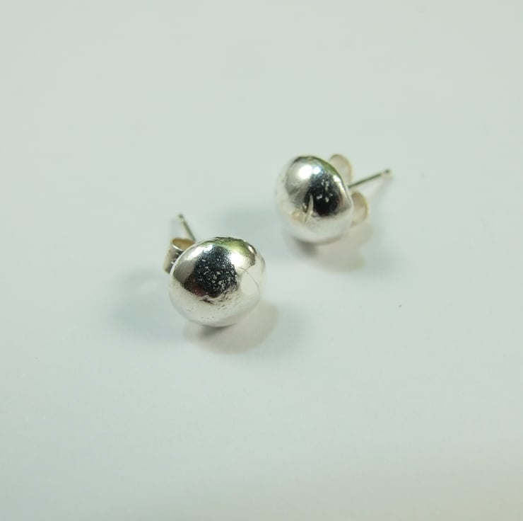 The small studs have been created from recycled sterling silver heated to melting point creating little silver nuggets. Soldered to regular .925 sterling silver ear posts with butterfly backs and burnished to a shine.