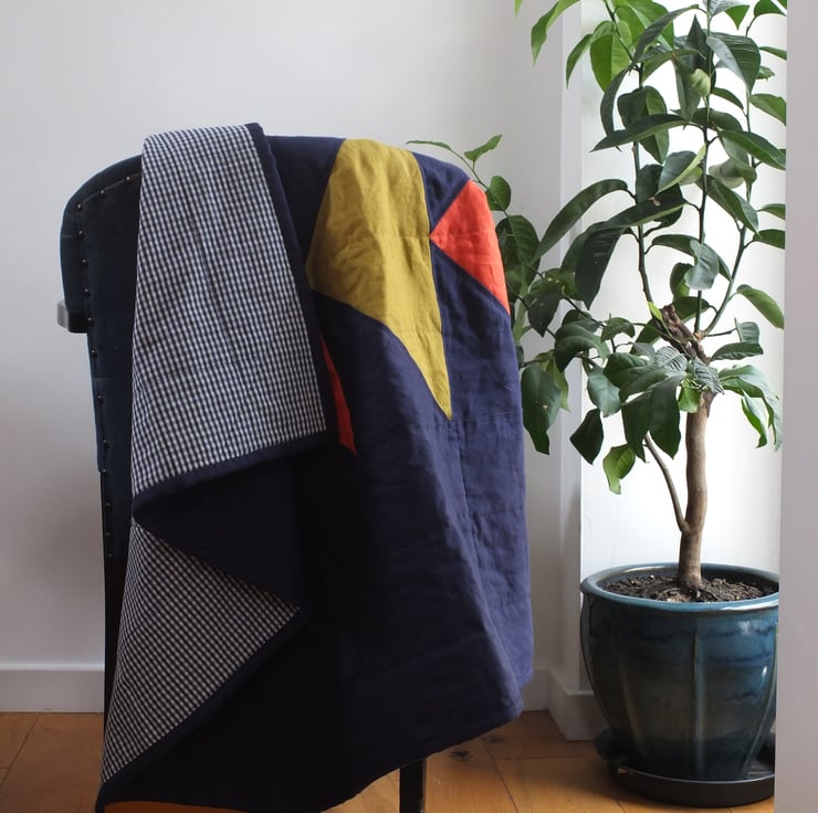 This linen patchwork quilt was made by me in my home studio in North Wales.