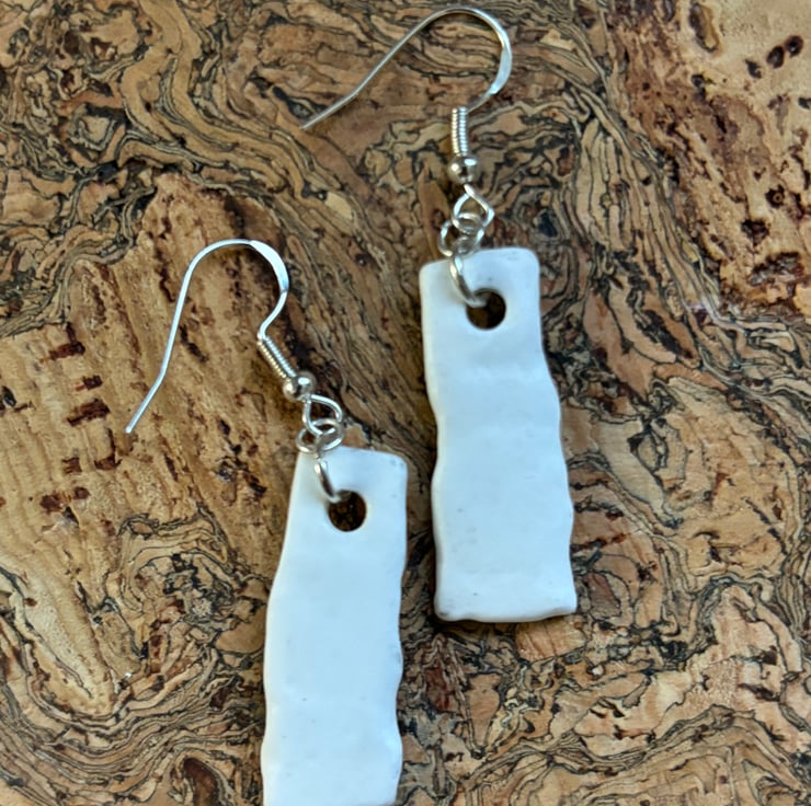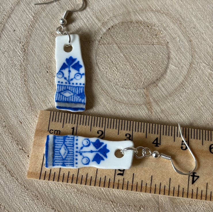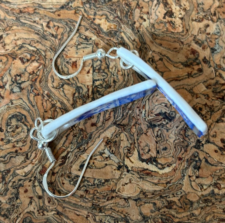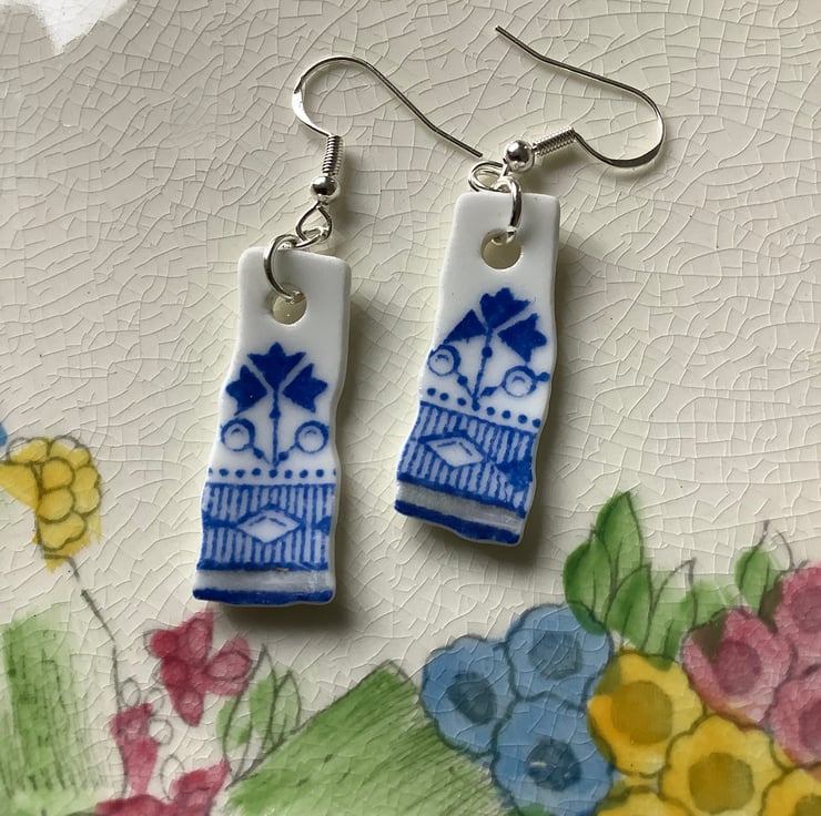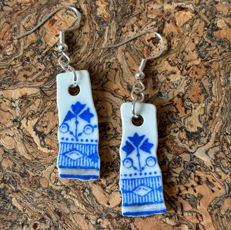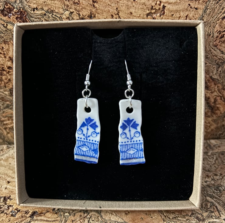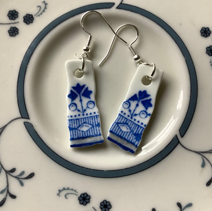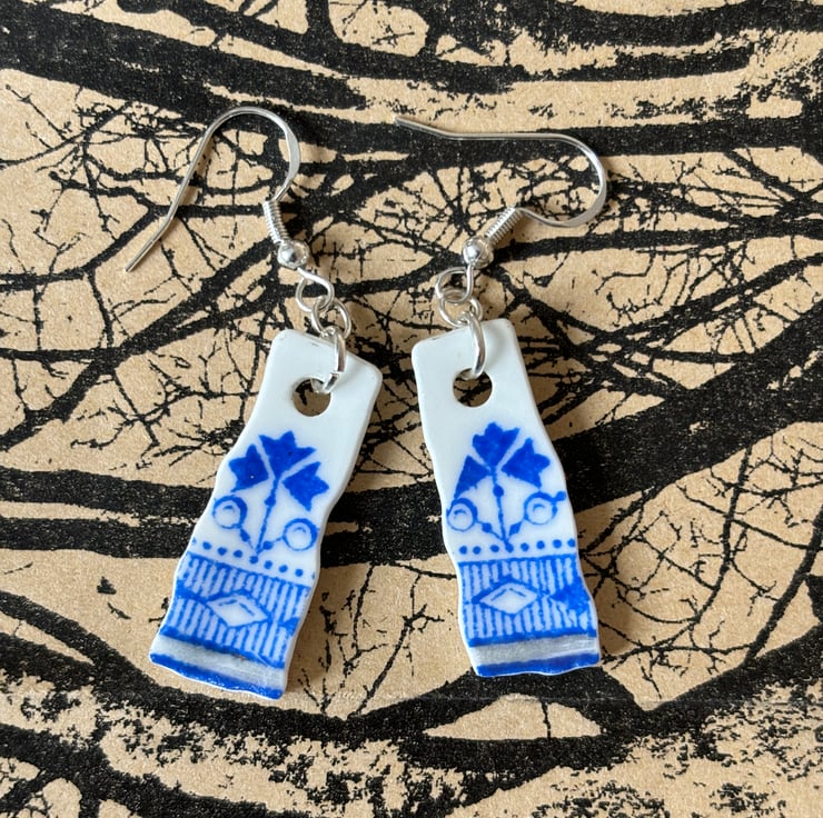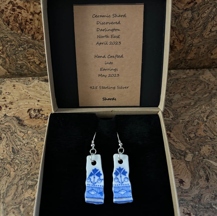 The idea is to keep the character of the ceramic found, the finished piece is not meant to be highly polished or perfect. Found by chance in a box in Darlington destined to be recycled, once a pretty plate destined to be thrown away, now a small pair of earrings. One of a kind, unique and eye catching.