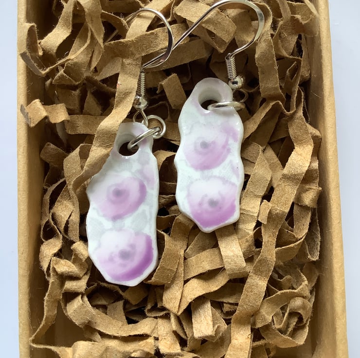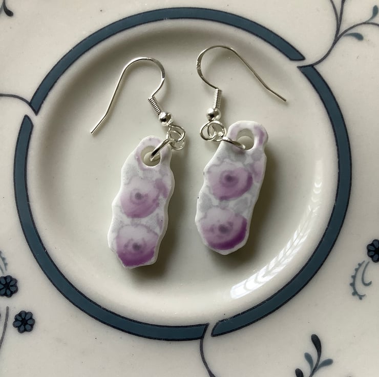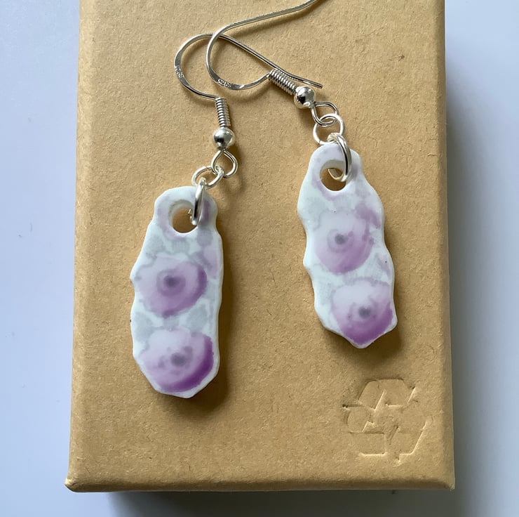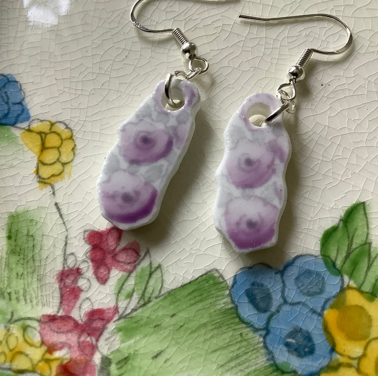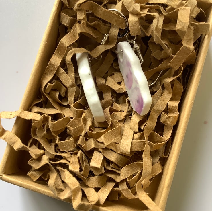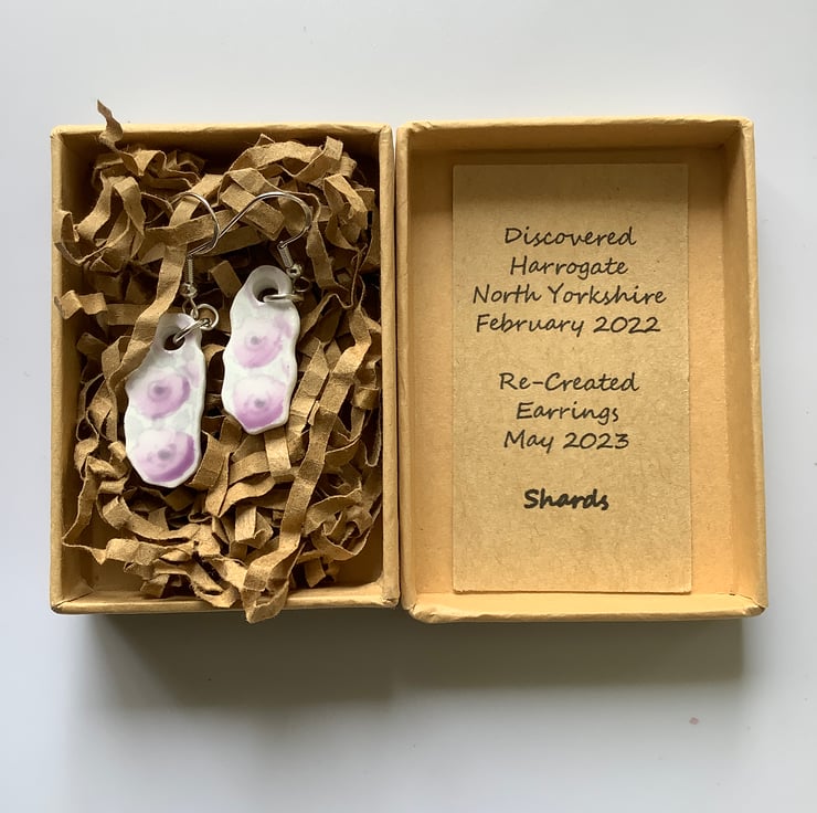 Hand crafted Jewellery and framed artworks using pre loved and discarded ceramics. Ceramic material will show signs of wear and damage. Entire process is a creative experience from discovery to final picture, nothing planned or preconceived. All materials personally collected from river banks, charity shops, roadside, woods, recycle centres, beaches, wherever dropped, dumped or donated ceramics are found, cleaned and shaped into new stories. Each piece comes with a short bio of where the ceramic came from, date found and re-created. Some shards collected are used as found, others are cut randomly which shape the final work. Every piece is individual, nothing replicated, however, due to repetitive patterns in ceramics there will be some similarity but only through the ceramic material not in the final piece.