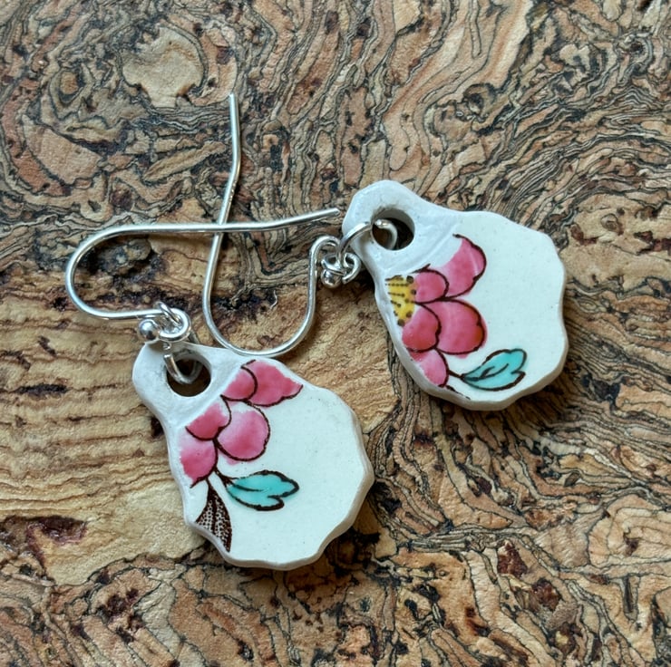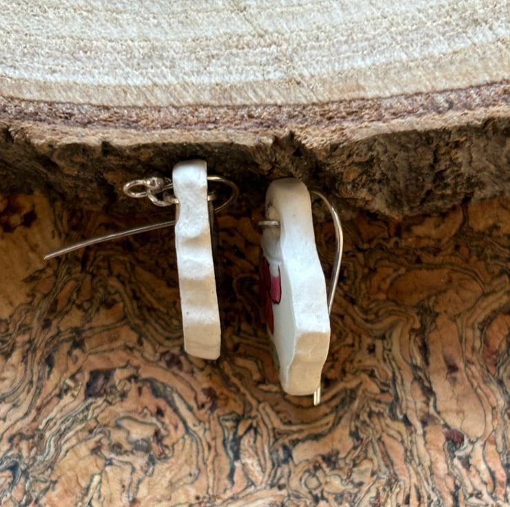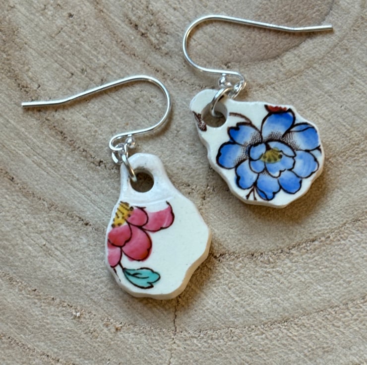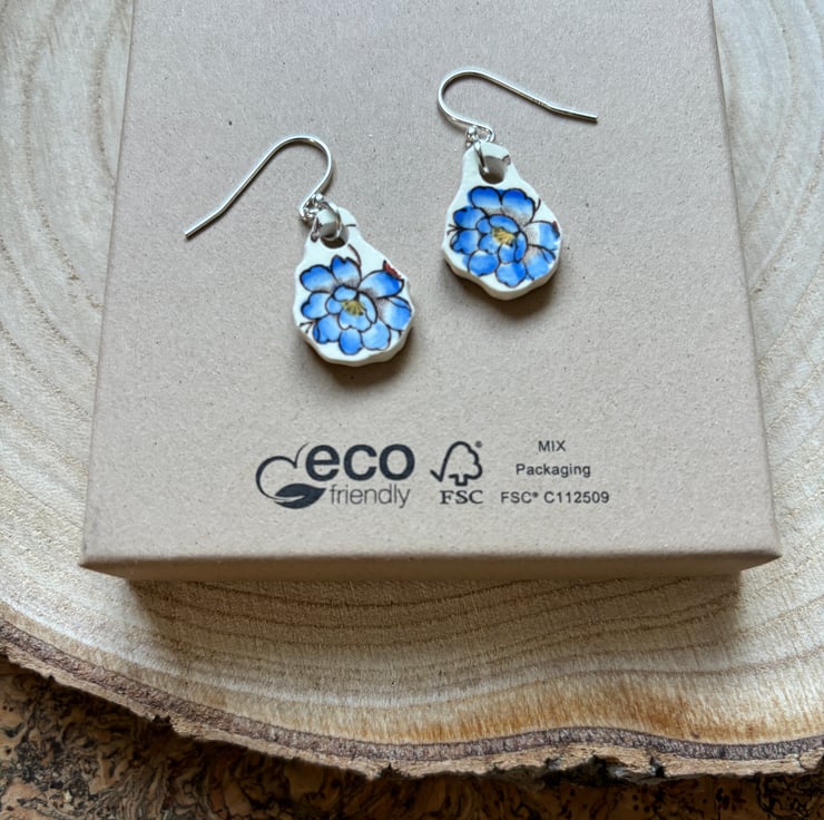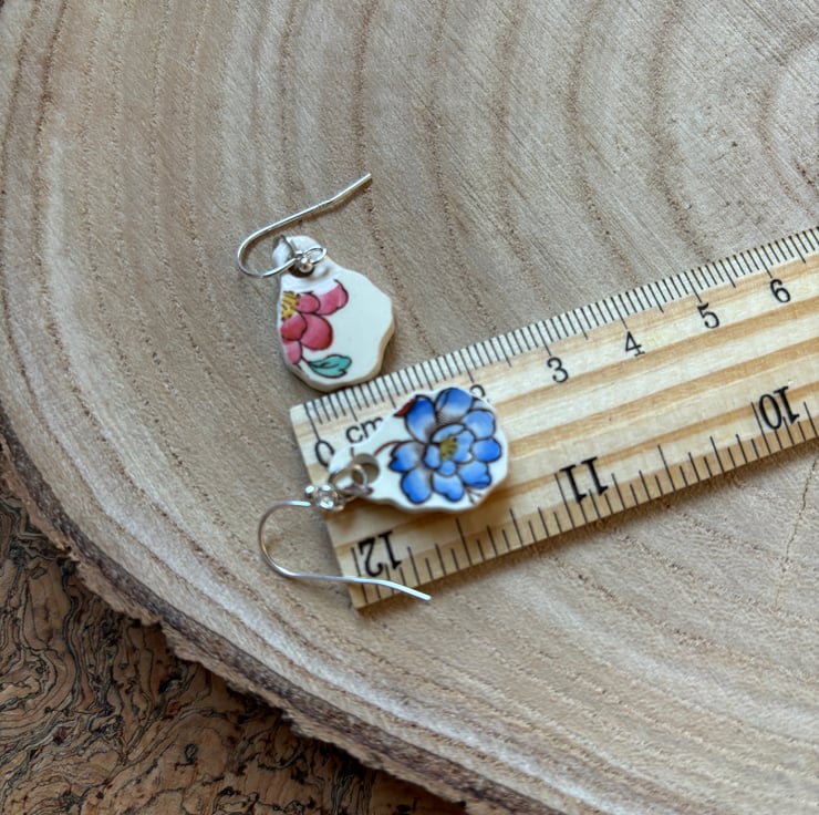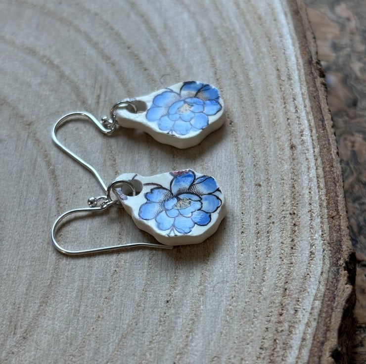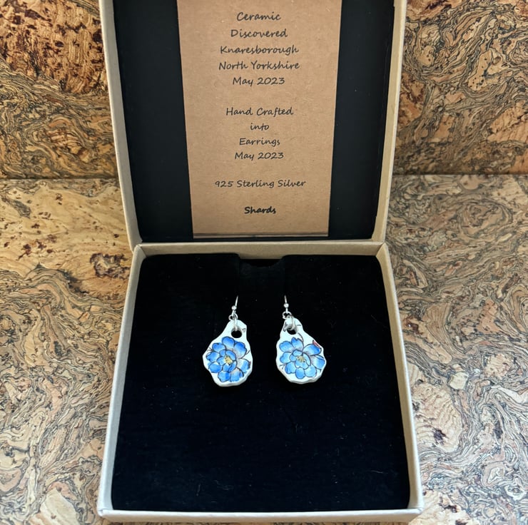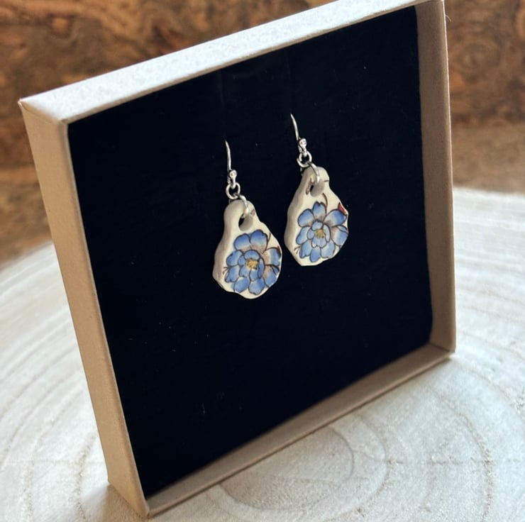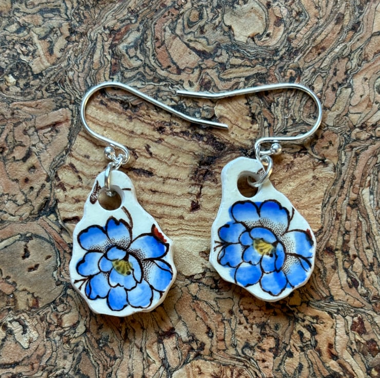 These earrings are made from the body of the cup, the pieces broke in similar shapes with the same blue flower in tact. I decided to use the shards as they were so only sanded the rough edges and drilled holes, front and back glaze is in good condition with the area around the hole on the back sanded.