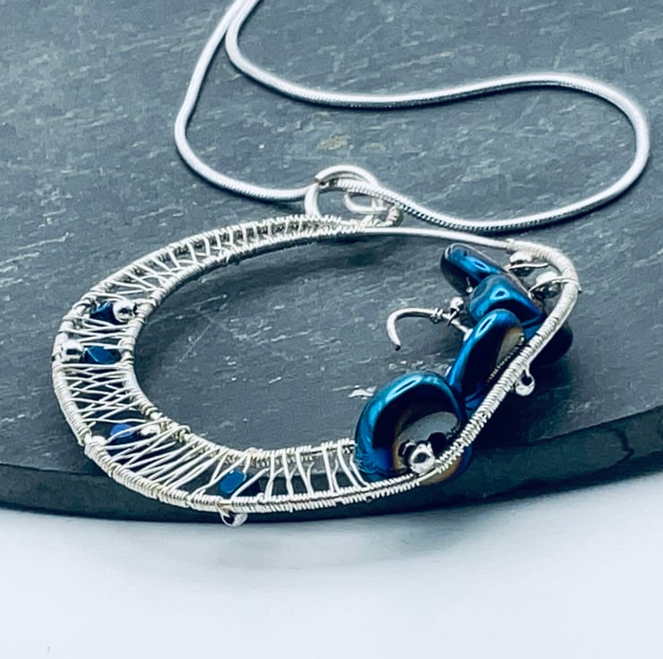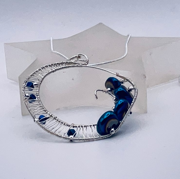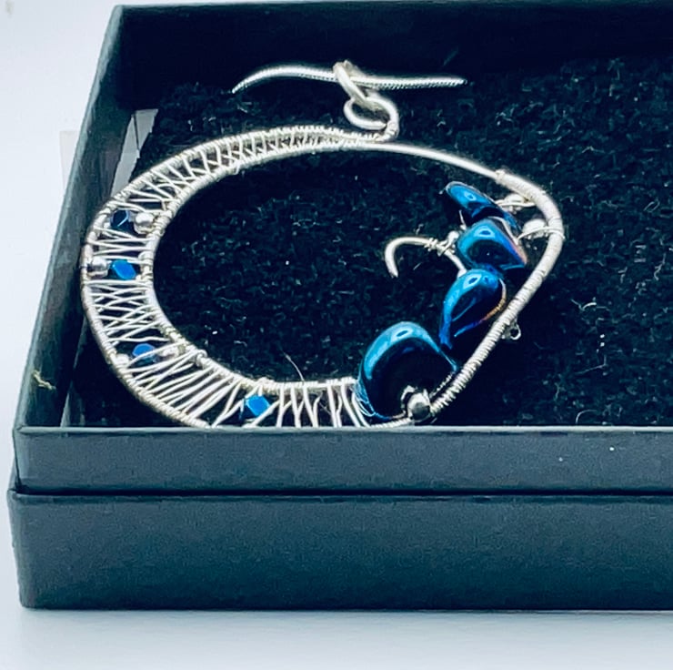 The shimmering deep blue hematite beads in two shapes enlighten this pendant to evoke a midnight hue! Hand wired in silver plate it will make the wearer feel very special indeed. Smart daywear or evening sparkle, it will make a great gift for yourself or someone you hold dear. 40 mm in diameter it hangs on a silver snake chain 550 mm long. Can be worn on the skin or on fabric in the blue or green shades or even with red or orange. Snap it up, just click the button!
