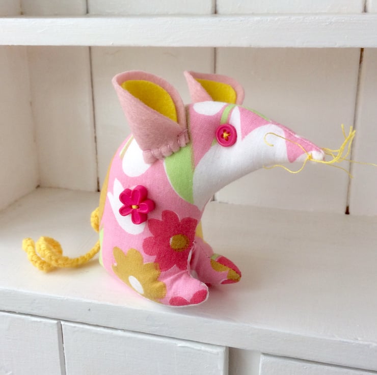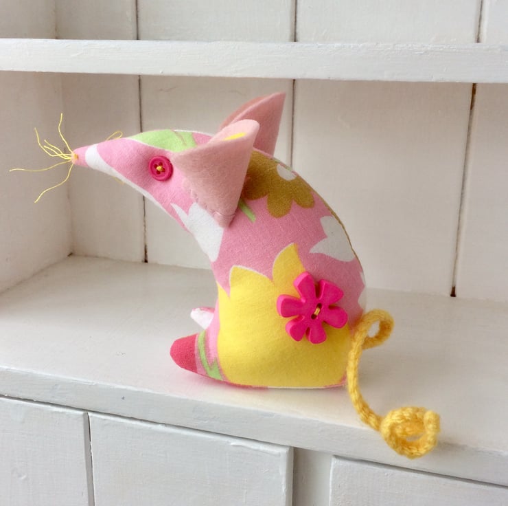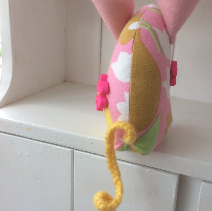 This delightful little mouse has button eyes, felt ears and a plaited wool tail and cotton whiskers. Bright pink flower button embellishments. SHe is approx 10cm tall from the tips of their toes to the top of their ears and approx 11cm from nose to his bottom.