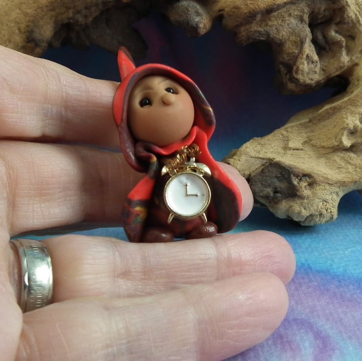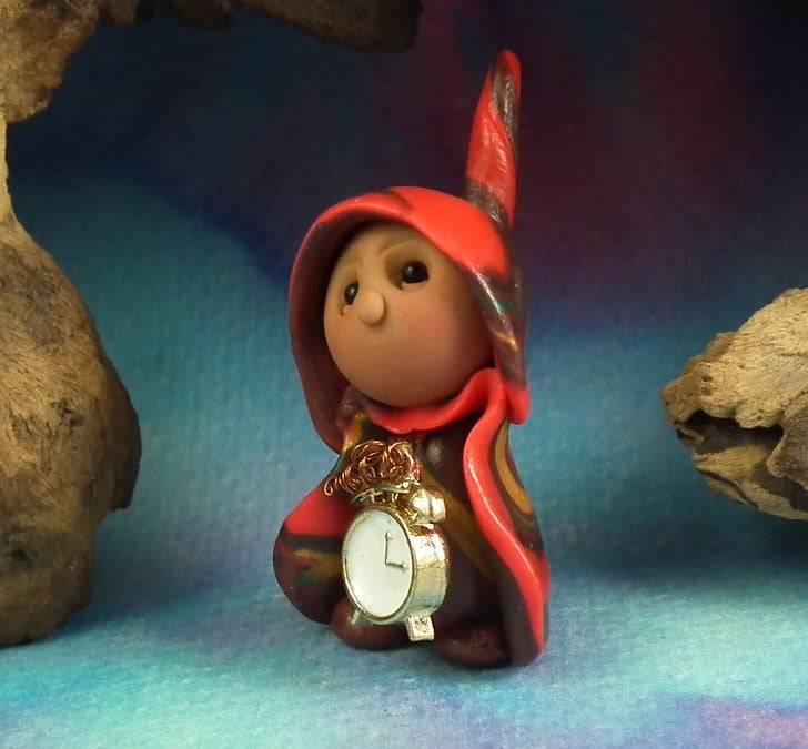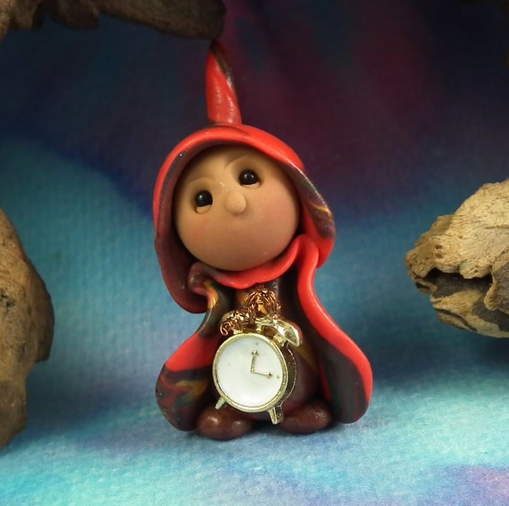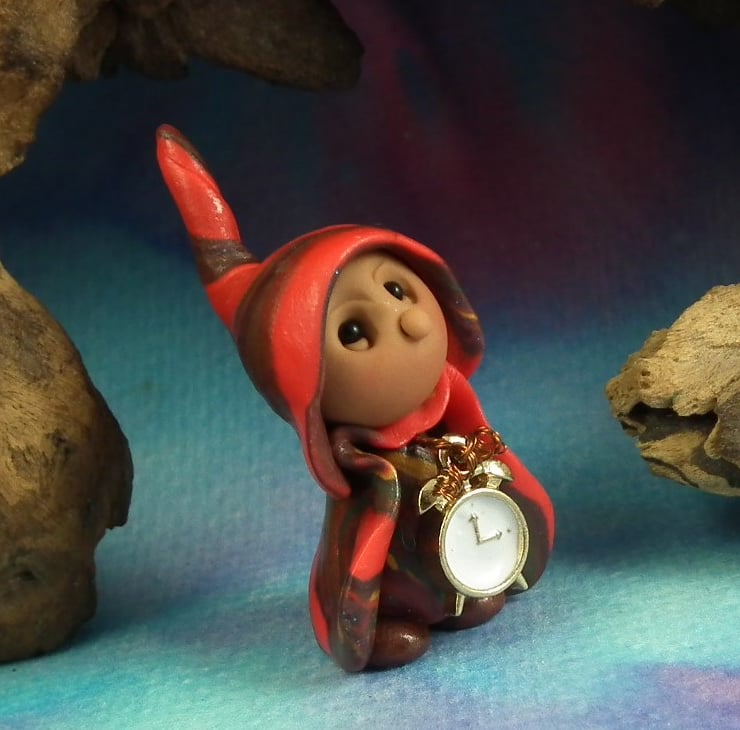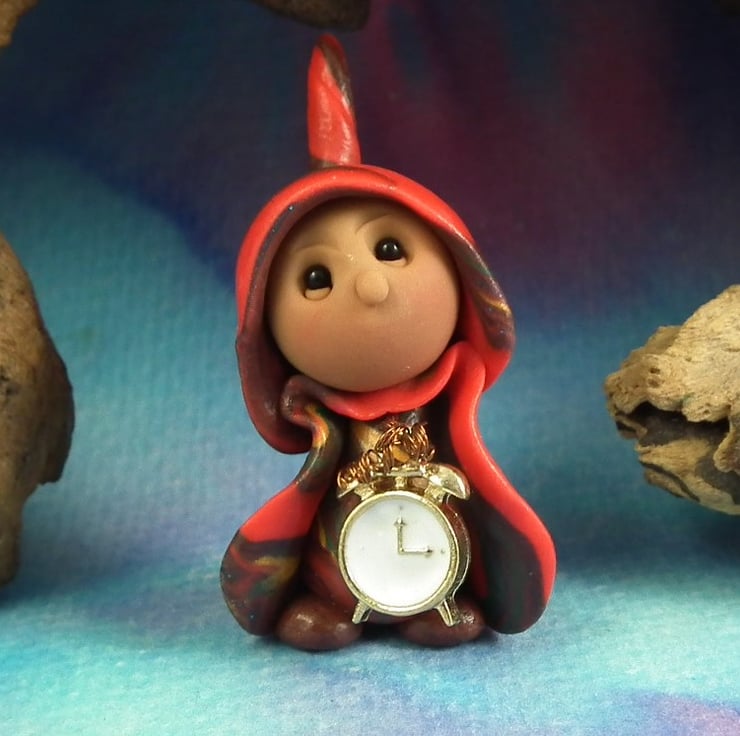 This is a 'one of a kind' creation having been entirely handmade without the use of moulds here at my studio on the Sussex Coast. Modelled with artist blend polymers, blushed before sealing with lacquer, Frimm has sparkling black onyx eyes and variegated robes. Frimm the Timekeeper Gnome is just one and a half inches tall.
