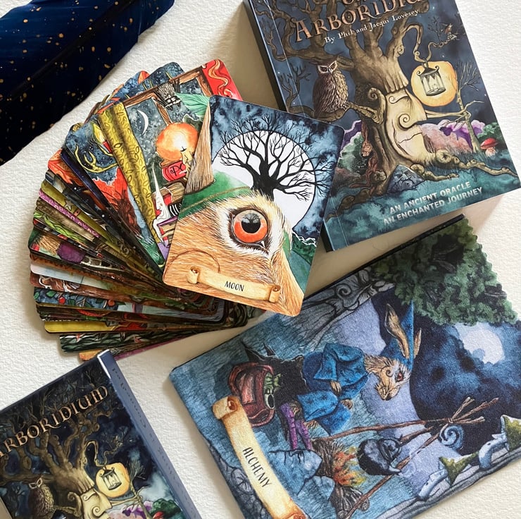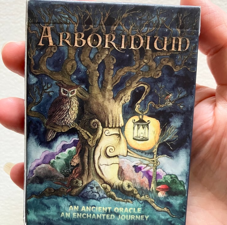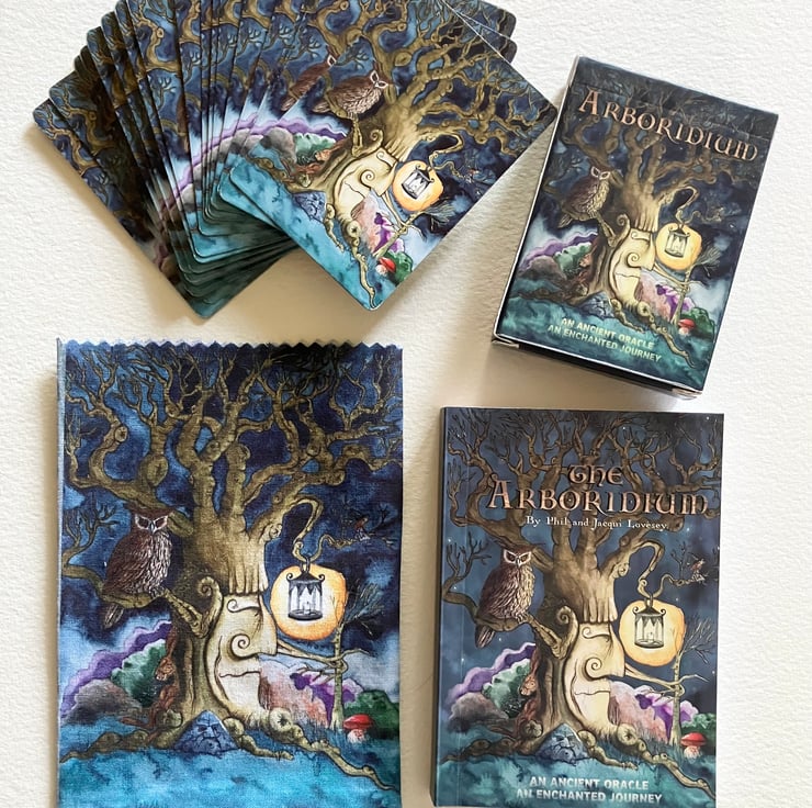 The Arboridium is a 'saztaculous' magically illustrated 44 card pocket sized oracle deck, with a full colour 180 page guidebook, in a specially printed handmade pouch.