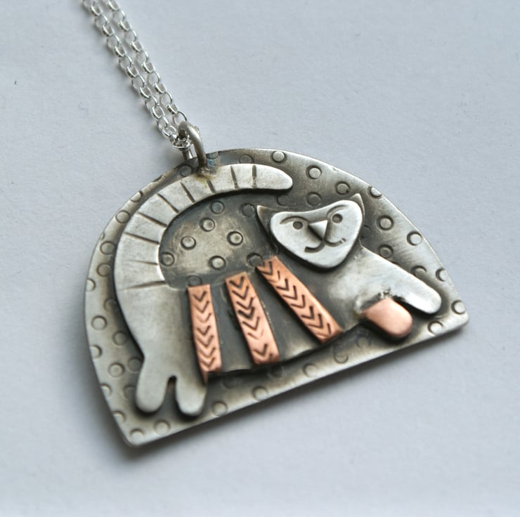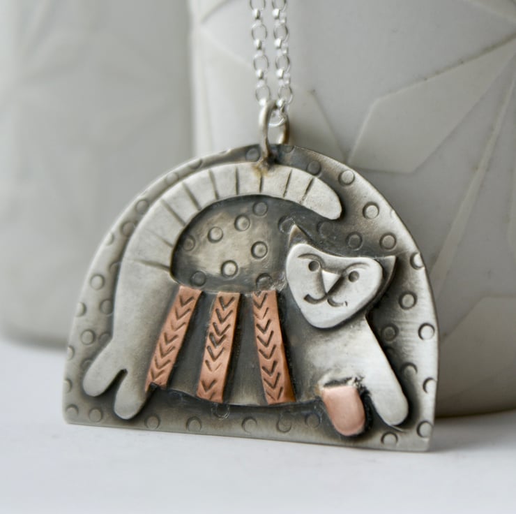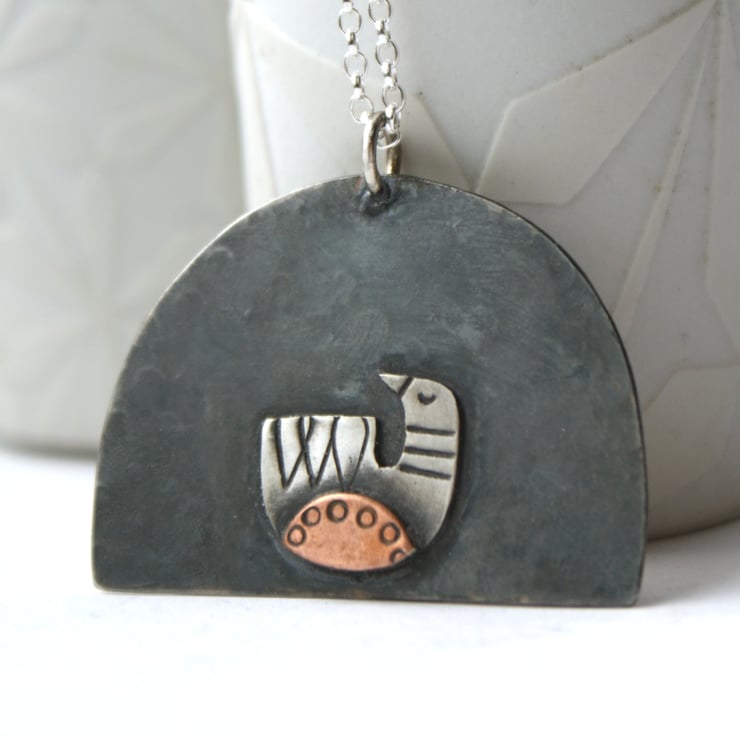 Made to order. A cute necklace featuring a stylised cat hand cut from layers of silver and copper. The pieces have been cut and textured before being soldered together, oxidised and partly polished back to a satin finish. There is a silver and copper bird on the reverse.