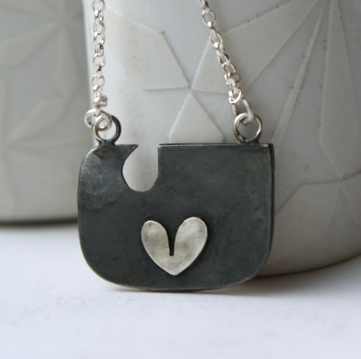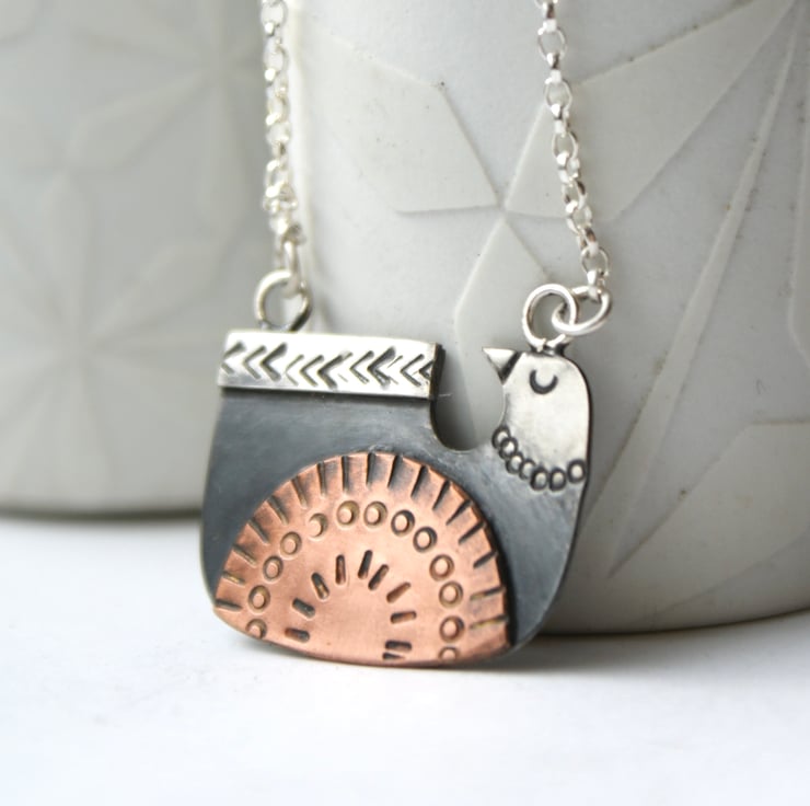 A fab necklace featuring a stylised bird with decorative details hanging from a sterling silver chain. The pieces are hand cut from layers of silver and copper and have been cut and textured before being soldered together, oxidised and partly polished back to a satin finish. There is a silver leaf on the reverse. The chain is adjustable between 16-19 inches.
