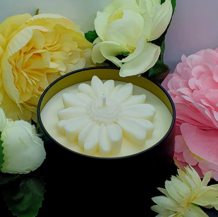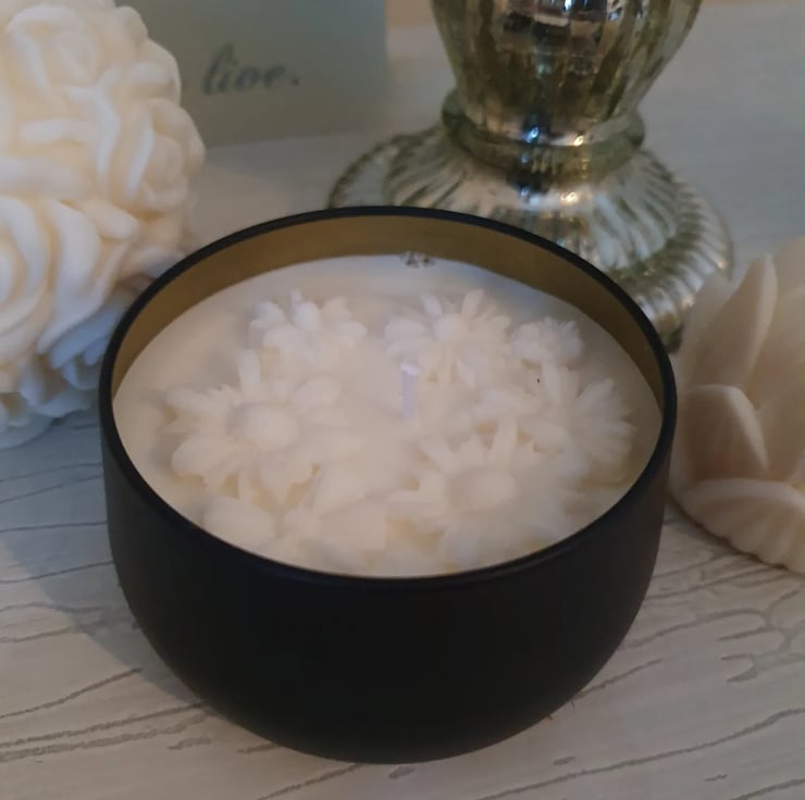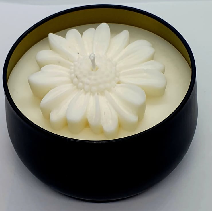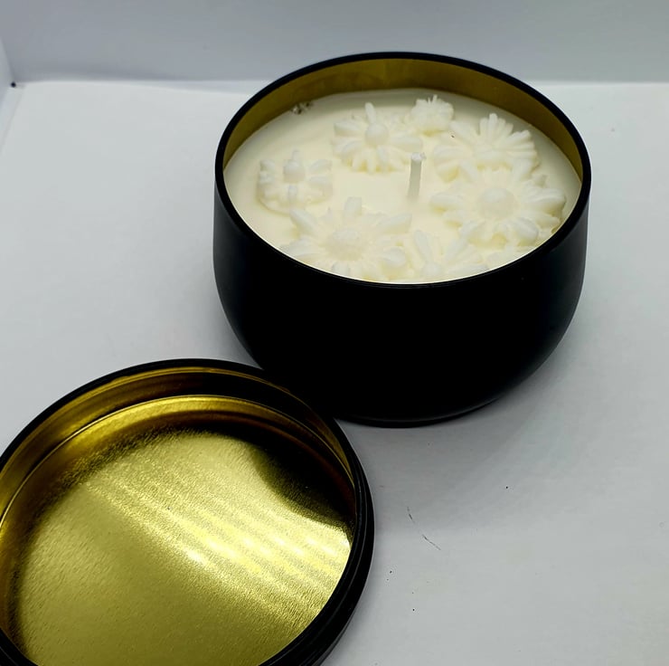 Beautiful Mixed Flowers or Daisy Candle, in a matt black Tin. With lid. Made with 100 % Soy Wax. And a gorgeous Fragrance of your choice.