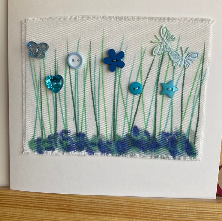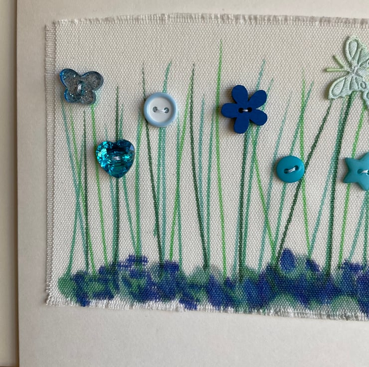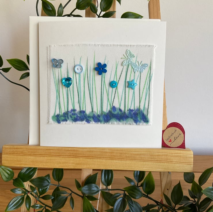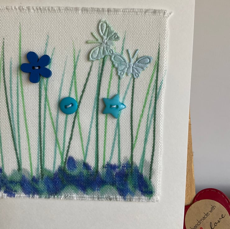 This hand crafted greetings card features a shades of blue and green hand coloured fabric background adorned with colour coordinated buttons and fabric butterflies. Inspired by the colours in my garden the subtle shades of green and blue provide the perfect backdrop to the hand sewn button and butterfly detail. The card would make a lovely framed picture.