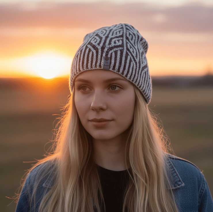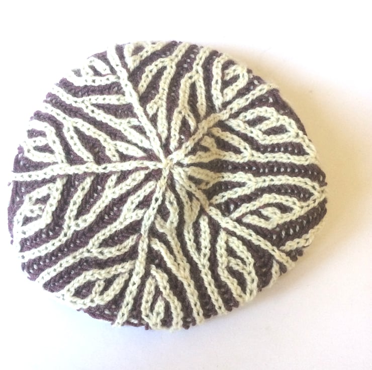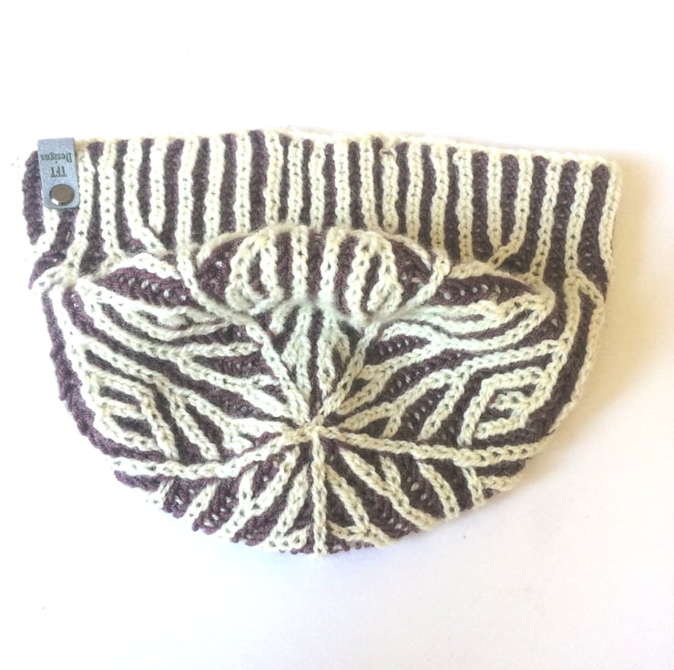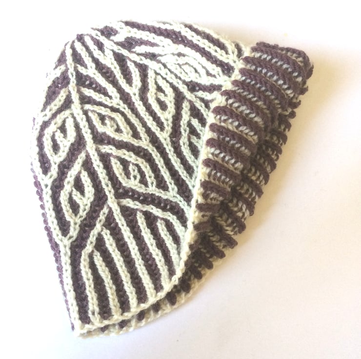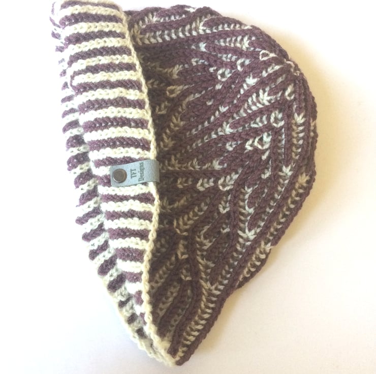 Loose fitting slouchy 2 coloured beanie hat with columns of leaves that come to a glorious crescendo at the crown. Hand knitted by Sandra using the brioche technique she so loves. Totally reversible too.