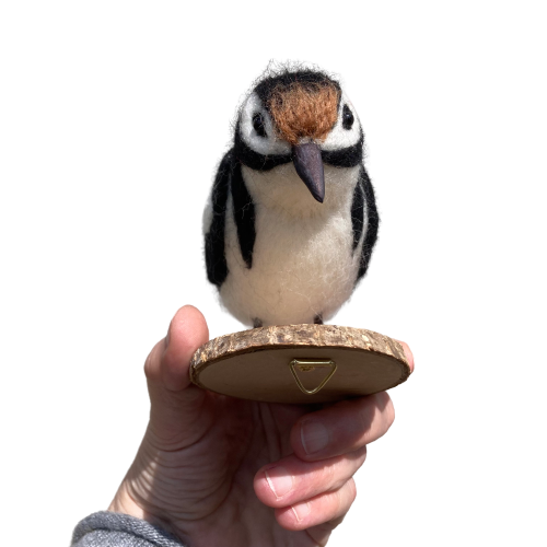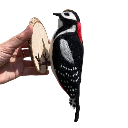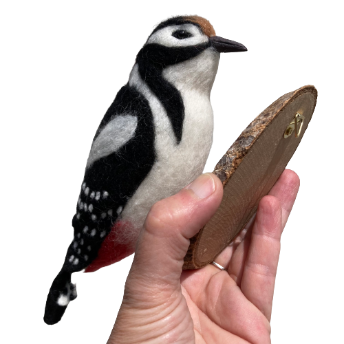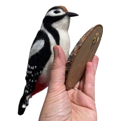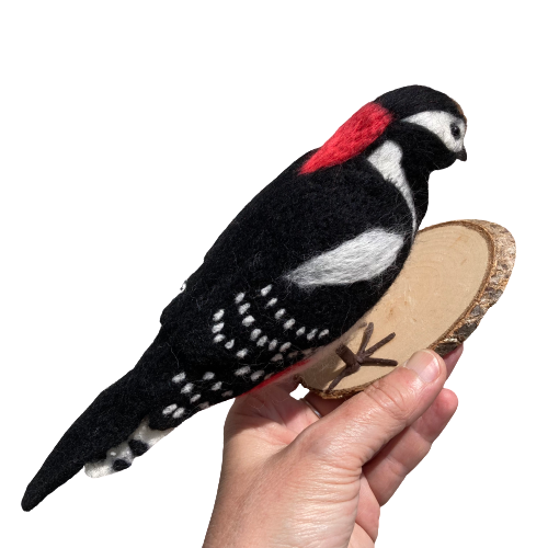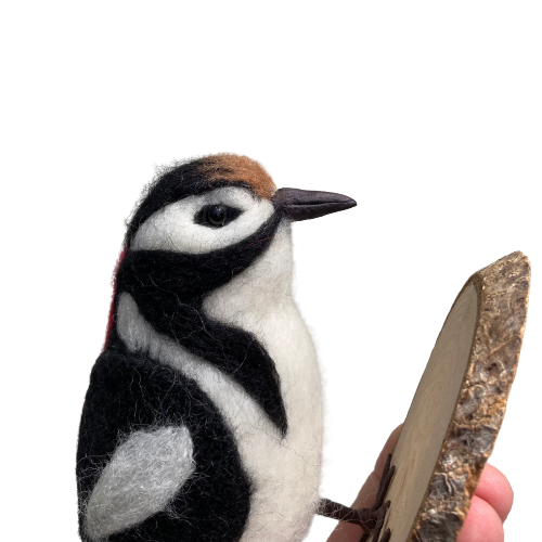 This needle felted woodpecker is roughly life size. It has been made using woollen fibres and a barbed felting needle. After sculpting a core of white wool into shape, a top coat of coloured merino wool fibres has been added. The beak is made from silk clay and the eyes are beaded.