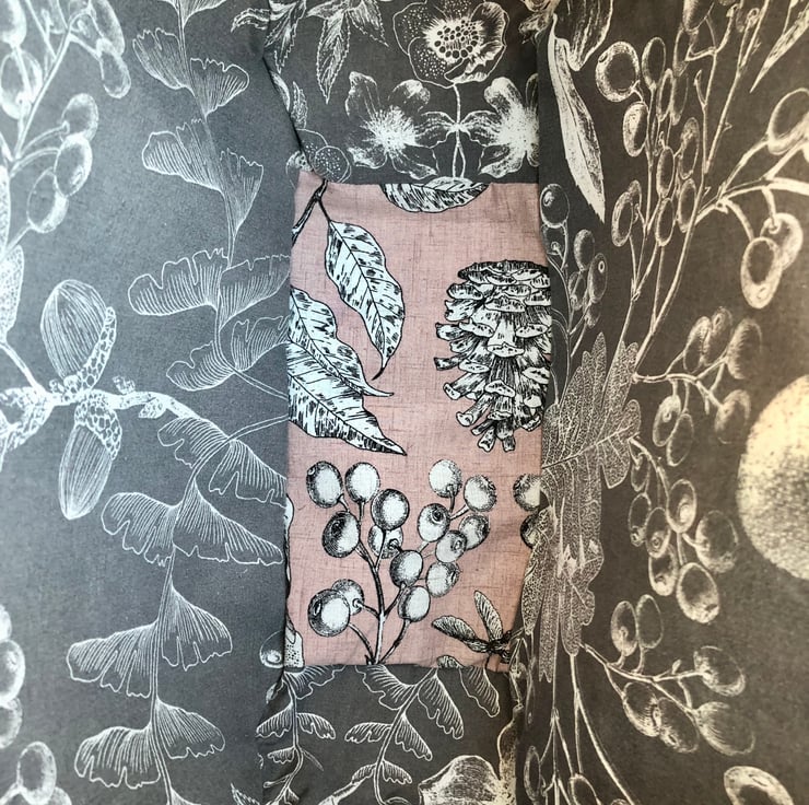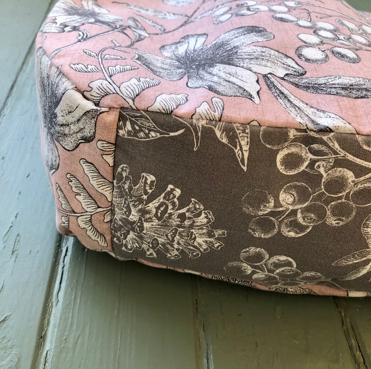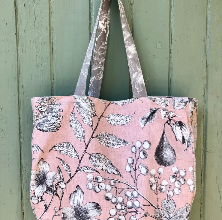A wonderful floral print bag made from up-cycled fabric. The outer is a lovely pale pink colour with a floral pattern and the base and handles are in a grey colour scheme with the same pattern. The lining matches the handles but has a pink base.