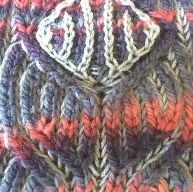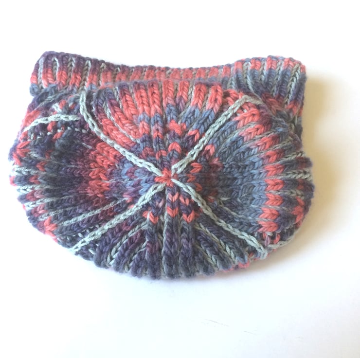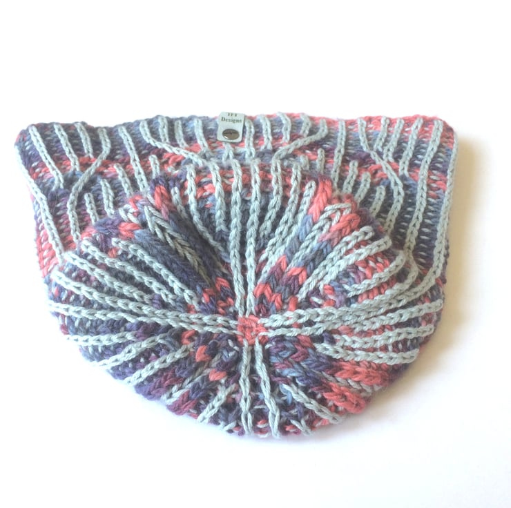 Gorgeous and unique is this hand knitted brioche hat. Knitted in a mix of wool, silk and cotton yarns to create 5 flower motifs on the side of the hat. Sandra has taken her brioche skills a little further with this hat creating the flower head in the background colour really making it stand out. Totally reversible too.