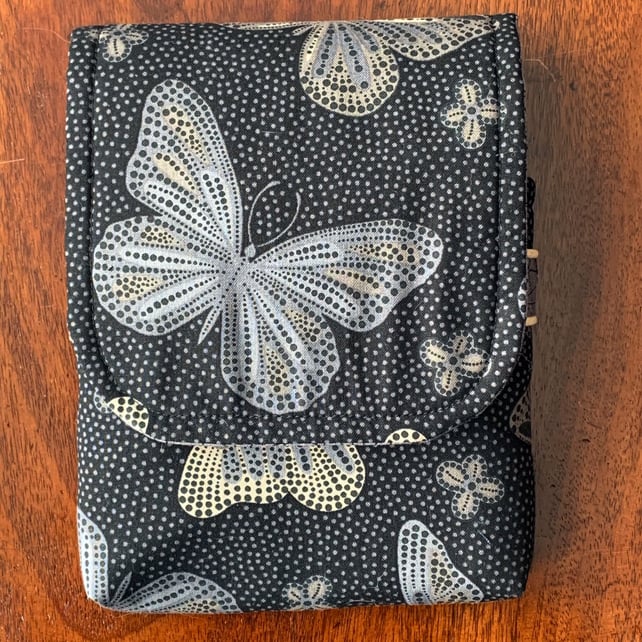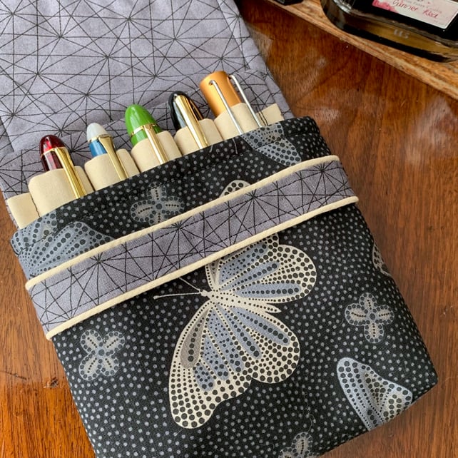 The outer, padded case contains a removable stiffened insert with fabric loops to hold, separate and protect the pens. All visible fabrics are 100% cotton. Three types of interlining provide cushioning, support and stability. The pen slots are 10 cm long so give excellent protection and will house all but the chunkiest of pens, while the tuck-under outer flap adjusts to accommodate extra-long pens. There is space behind the insert in which to tuck a note of pens and inks, plus a small slim notebook. Only a very limited number of each case will be made.