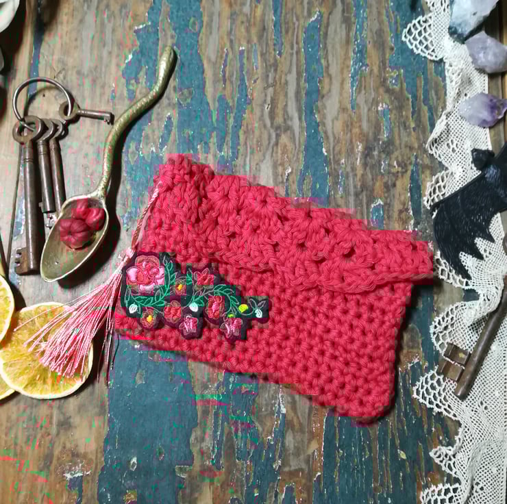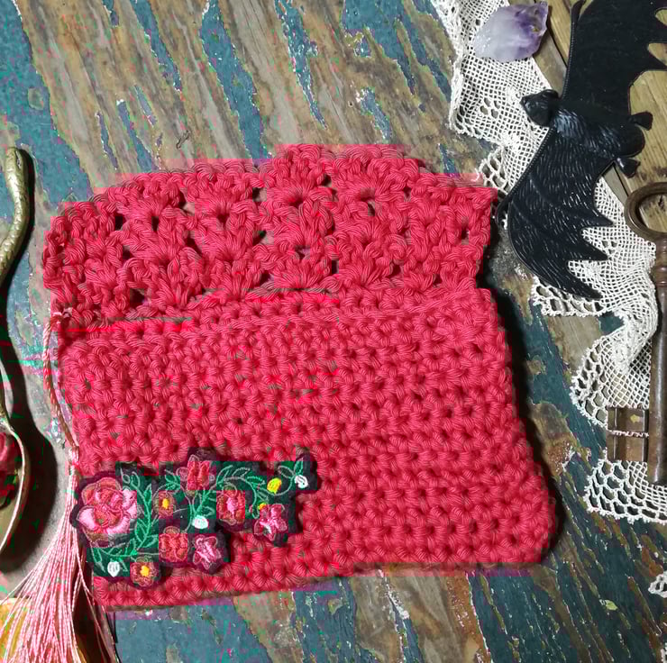 This pouch is made for keeping your tarot card deck. It is made from a lovely cotton yarn and has a decorative stitch top flap.