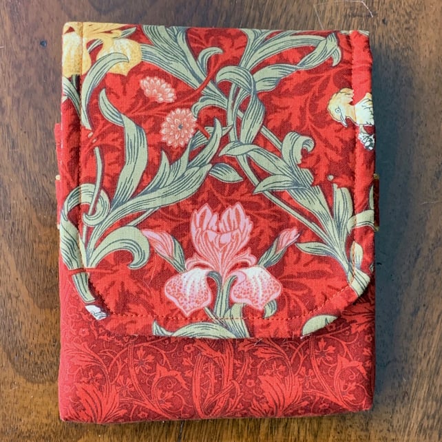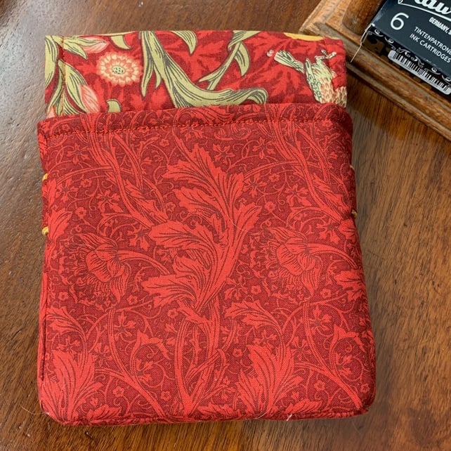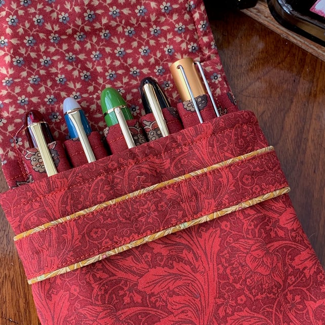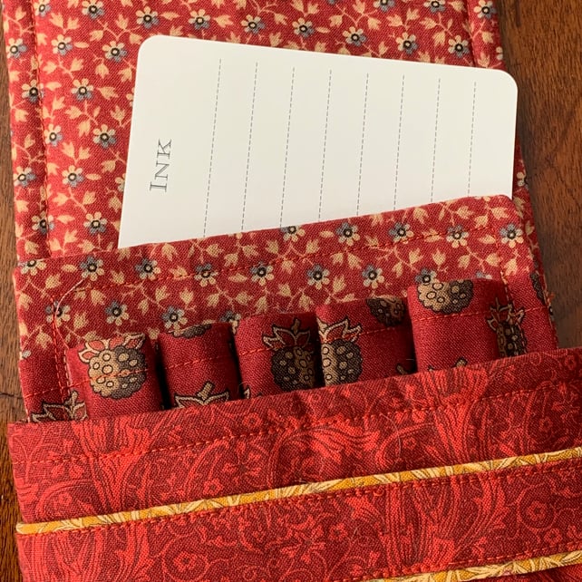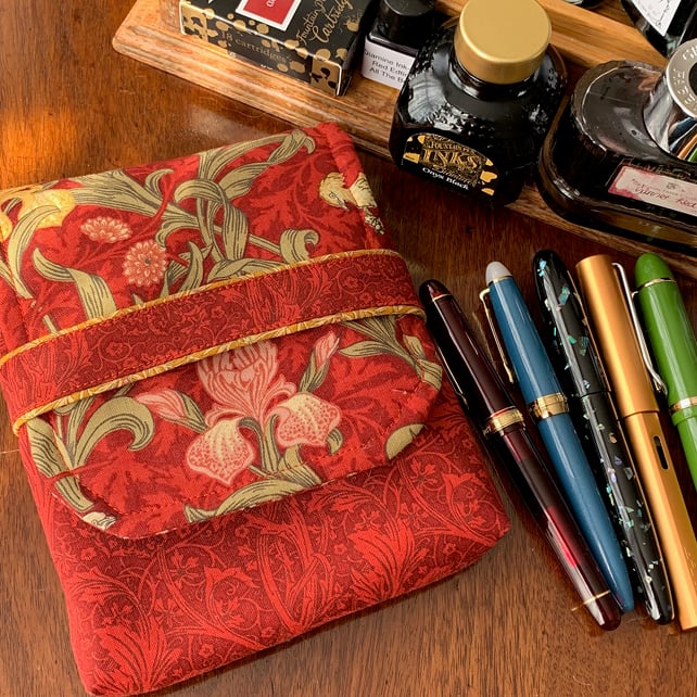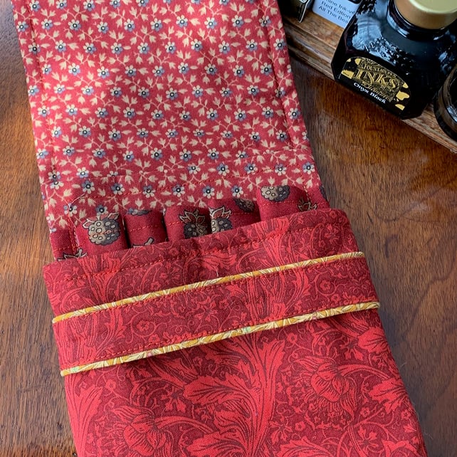 The outer, padded case contains a removable stiffened insert with fabric loops to hold, separate and protect the pens. All visible fabrics are 100% cotton. Three types of interlining provide cushioning, support and stability. The pen slots are 10 cm long so give excellent protection and will house all but the chunkiest of pens, while the tuck-under outer flap adjusts to accommodate extra-long pens. There is space behind the insert in which to tuck a note of pens and inks, plus a small slim notebook. Only a very limited number of each case will be made.