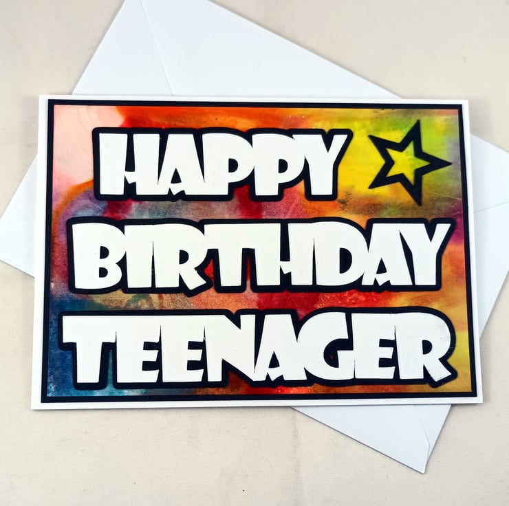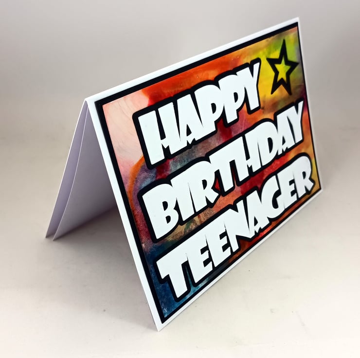 A6, landscape birthday card with the sentiment 'Happy Birthday Teenager' cut from white card, mounted onto black card and overlaid onto a unique, multi coloured background created using distress inks. The card is further embellished with a black star in the top right corner. The insert is left blank for your own message.