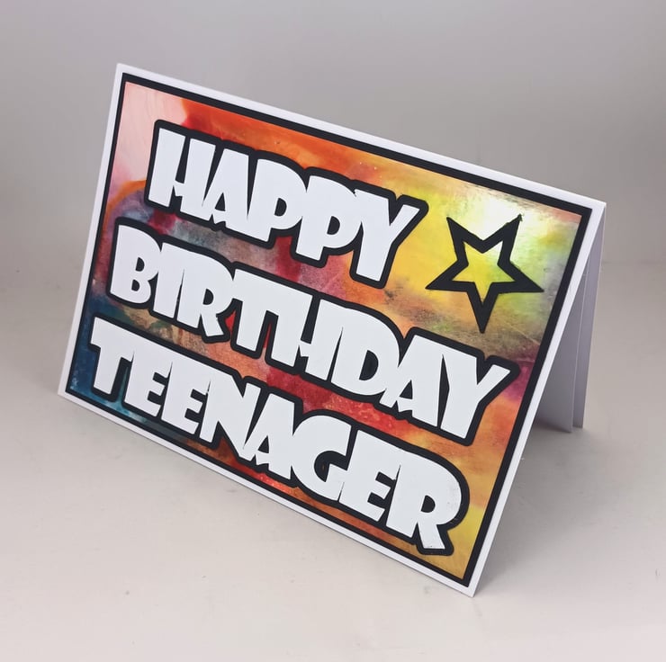 A6, landscape birthday card with the sentiment 'Happy Birthday Teenager' cut from white card, mounted onto black card and overlaid onto a unique, multi coloured background created using distress inks. The card is further embellished with a black star in the top right corner. The insert is left blank for your own message.