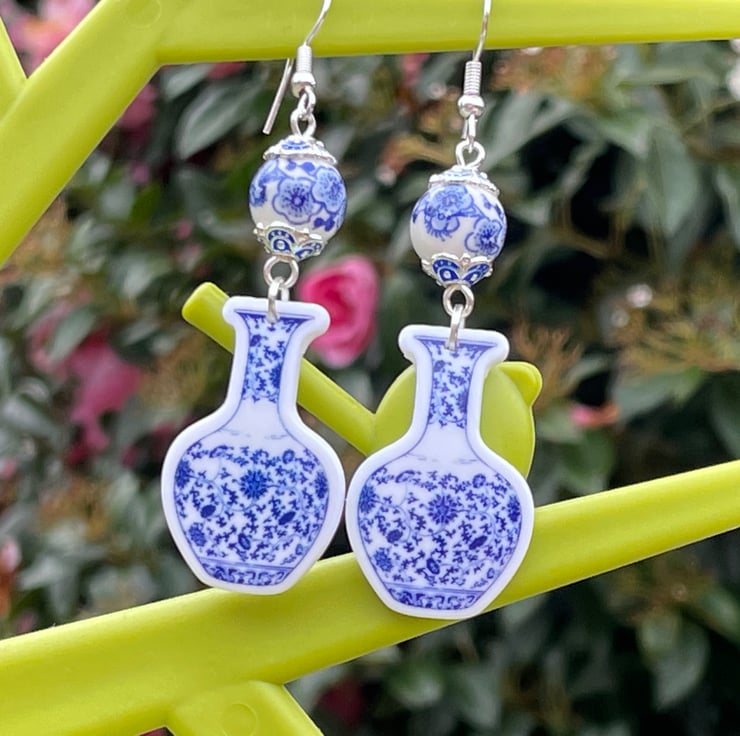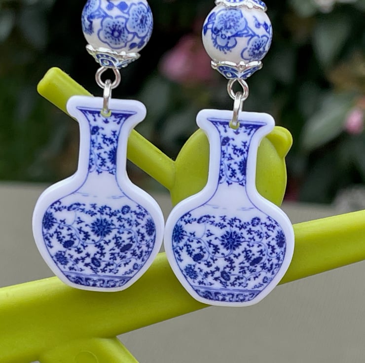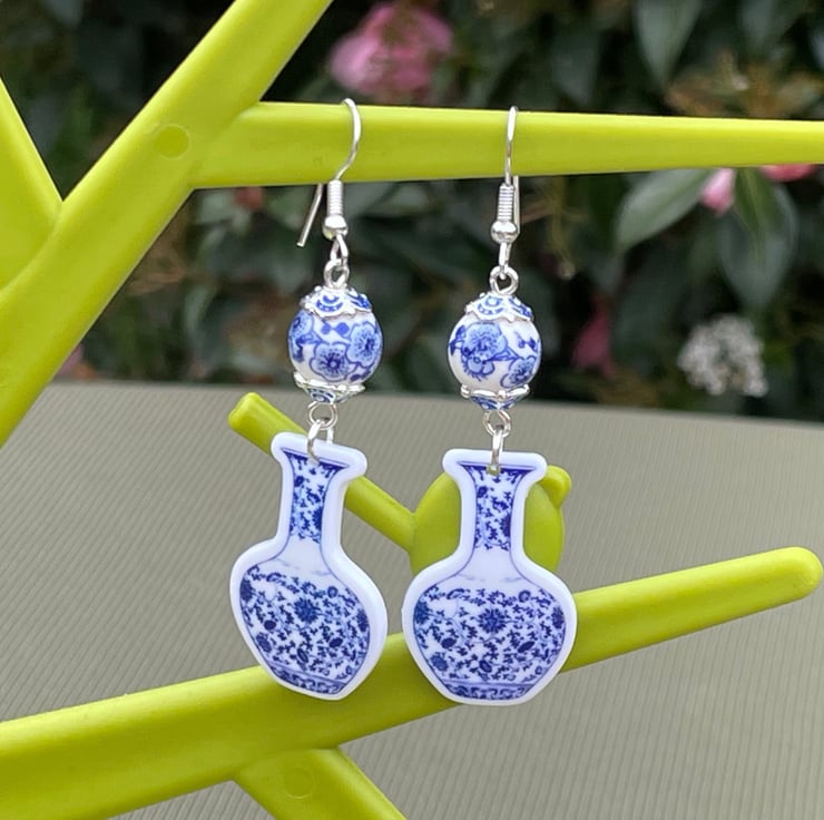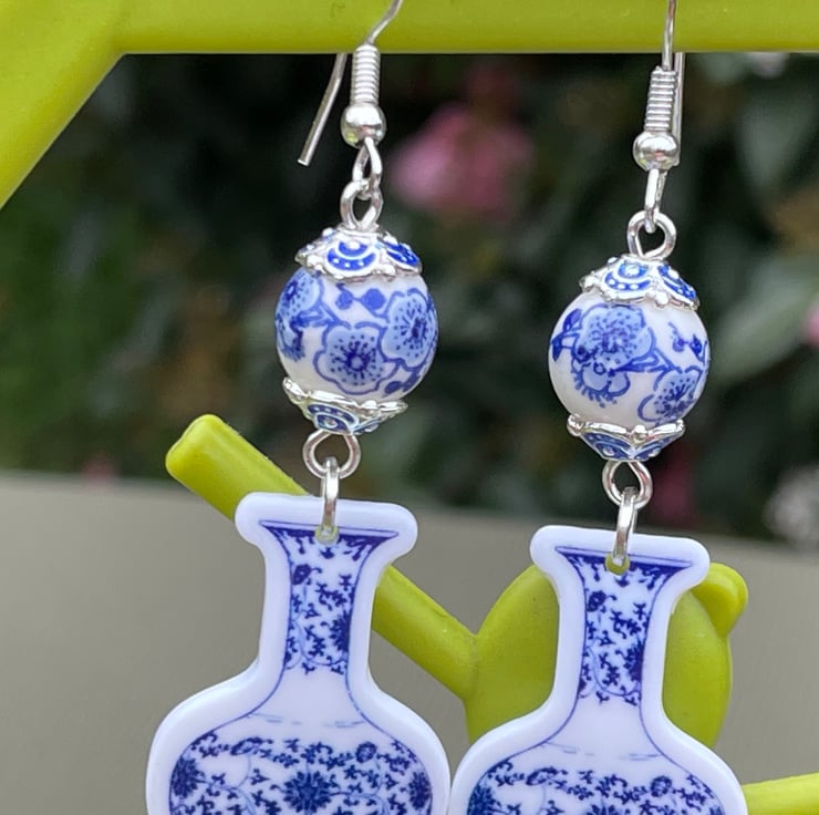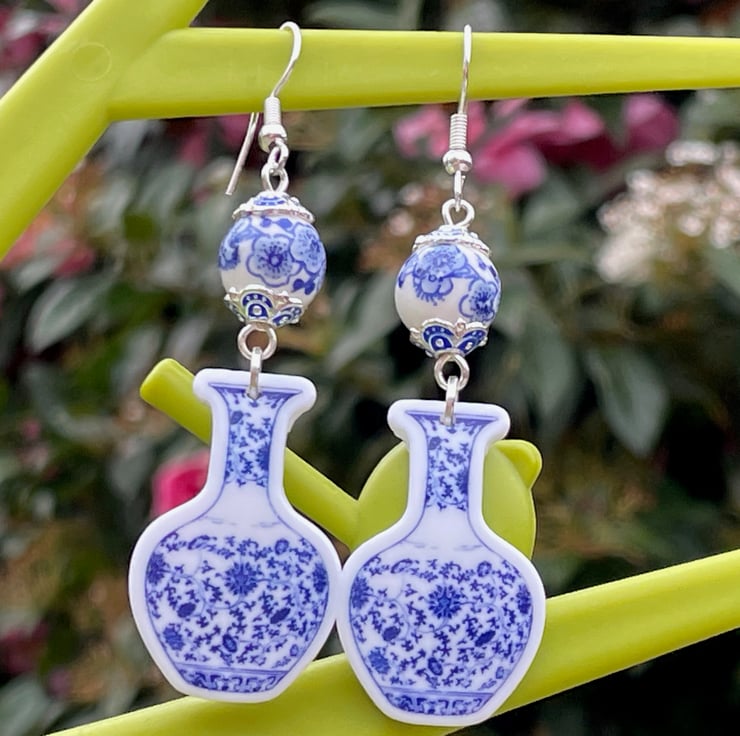 I've used resin vase charms in a gorgeous blue and white pattern willow style and paired them with ceramic beads in blue on white. I've finished off with silver and blue enamelled beadcaps and silver plated hypo allergenic ear wires.