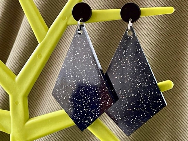BLACK GLITTER EARRINGS disco resin kite shape large festival retro