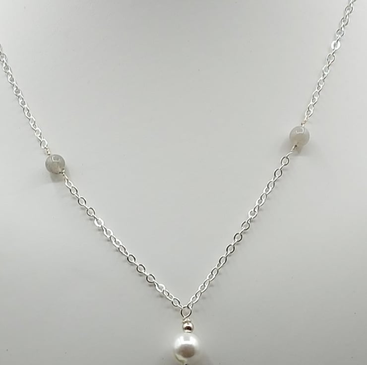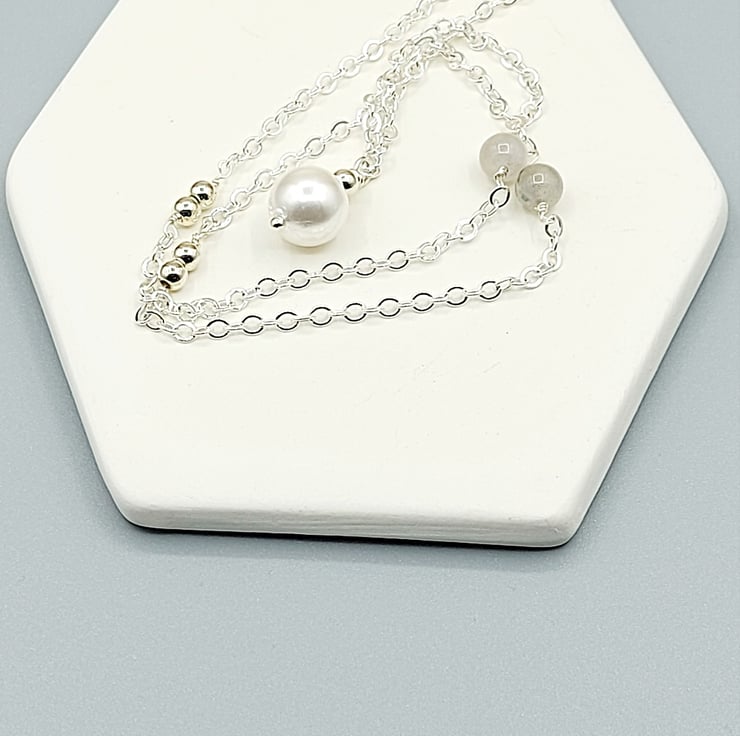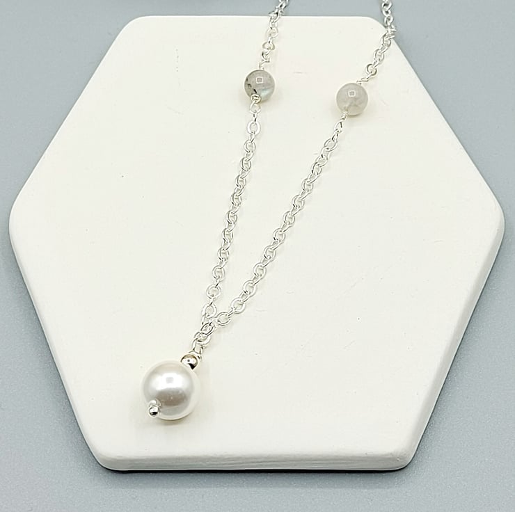 The sterling silver necklace featured: Pearl, labradorite gemstone and silver beads.