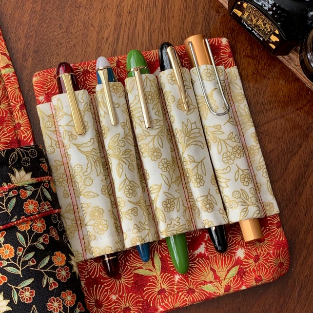 The outer, padded case contains a removable stiffened insert with fabric loops to hold, separate and protect the pens. All visible fabrics are 100% cotton. Three types of interlining provide cushioning, support and stability. The pen slots are 10 cm long so give excellent protection and will house all but the chunkiest of pens, while the tuck-under outer flap adjusts to accommodate extra-long pens. There is space behind the insert in which to tuck a note of pens and inks, plus a small slim notebook. Only a very limited number of each case will be made.