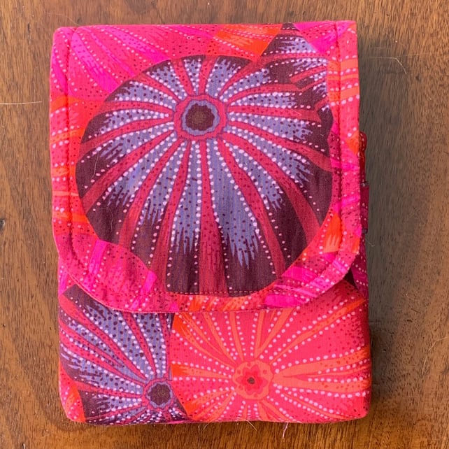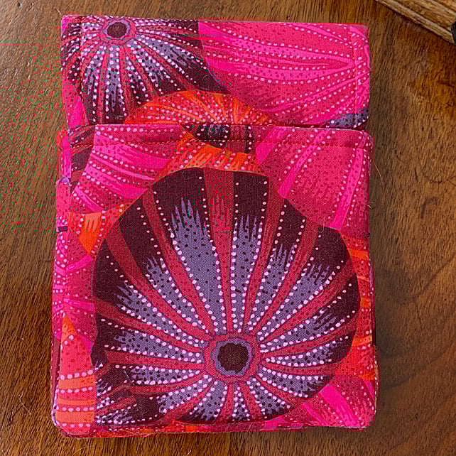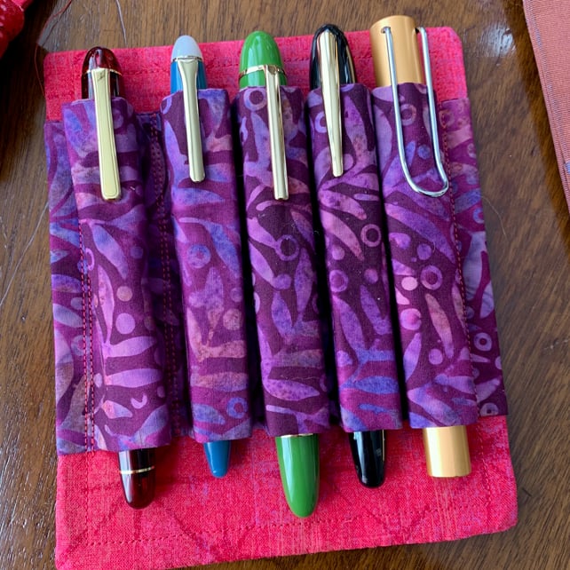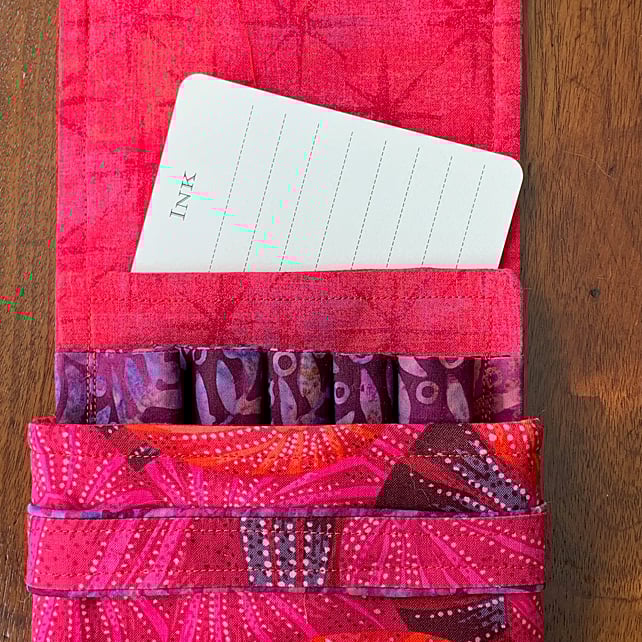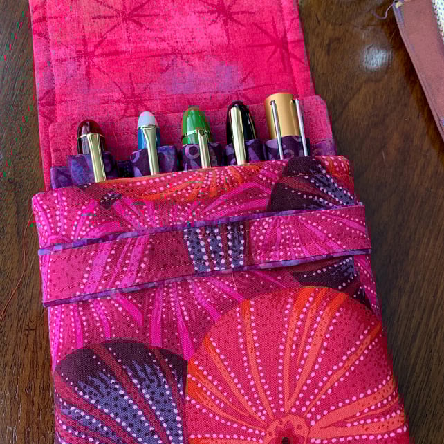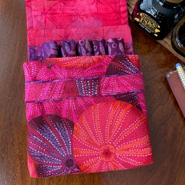 The outer, padded case contains a removable stiffened insert with fabric loops to hold, separate and protect the pens. All visible fabrics are 100% cotton. Three types of interlining provide cushioning, support and stability. The pen slots are 10 cm long so give excellent protection and will house all but the chunkiest of pens, while the tuck-under outer flap adjusts to accommodate extra-long pens. There is space behind the insert in which to tuck a note of pens and inks, plus a small slim notebook. Only a very limited number of each case will be made.